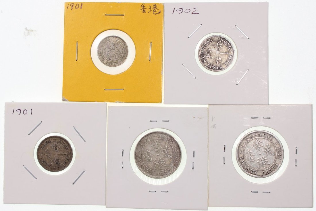Hong Kong, a group of 5x coins, consists of 1 cent, 1901, 10 cents(2), 1901 and 1902, and 20 cents(2), 1893, fine to extremely fine, viewing recommended (5).