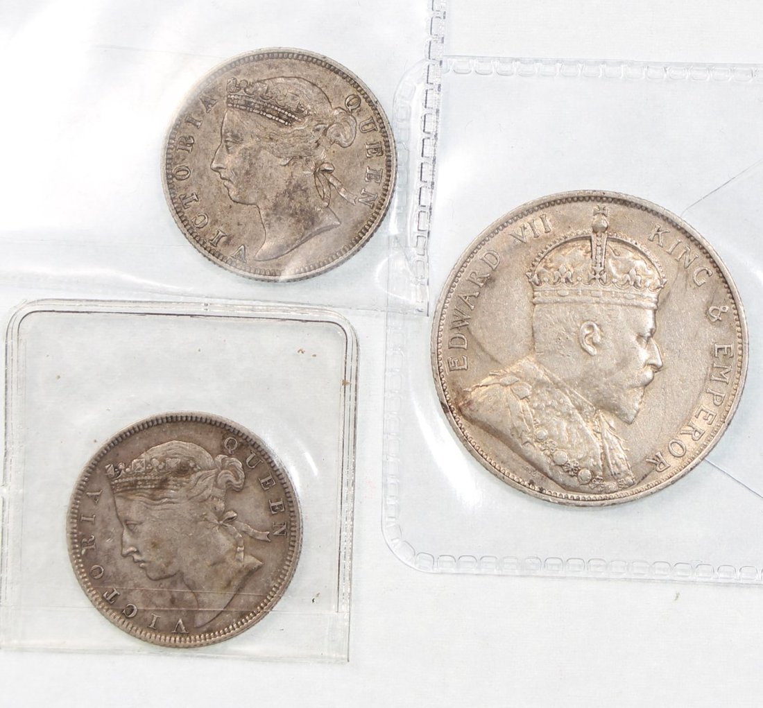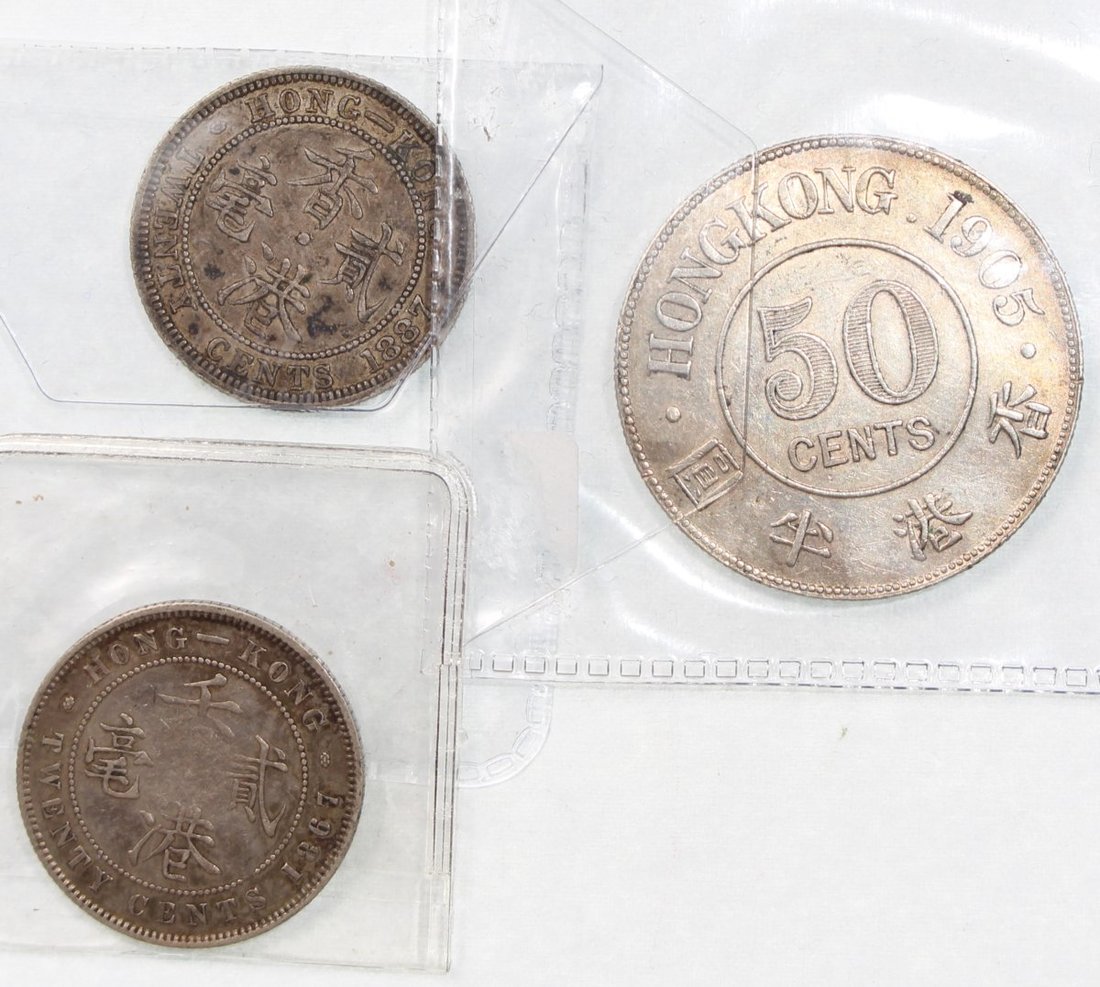 Hong Kong, group of 3 silver coins consisting of: 2x silver 20 cents, 1867 and 1887, and silver 50 cents, 1905,