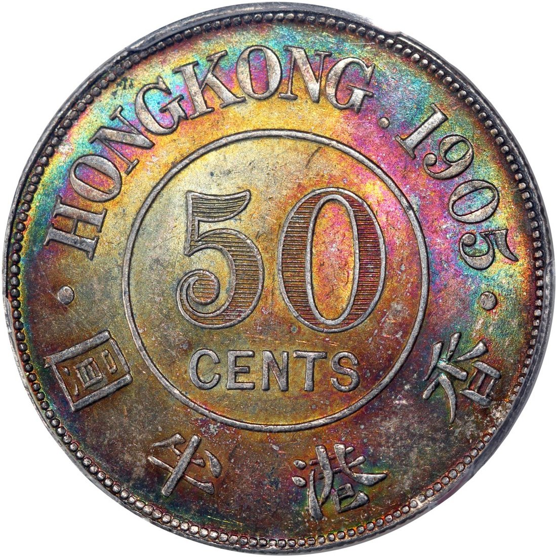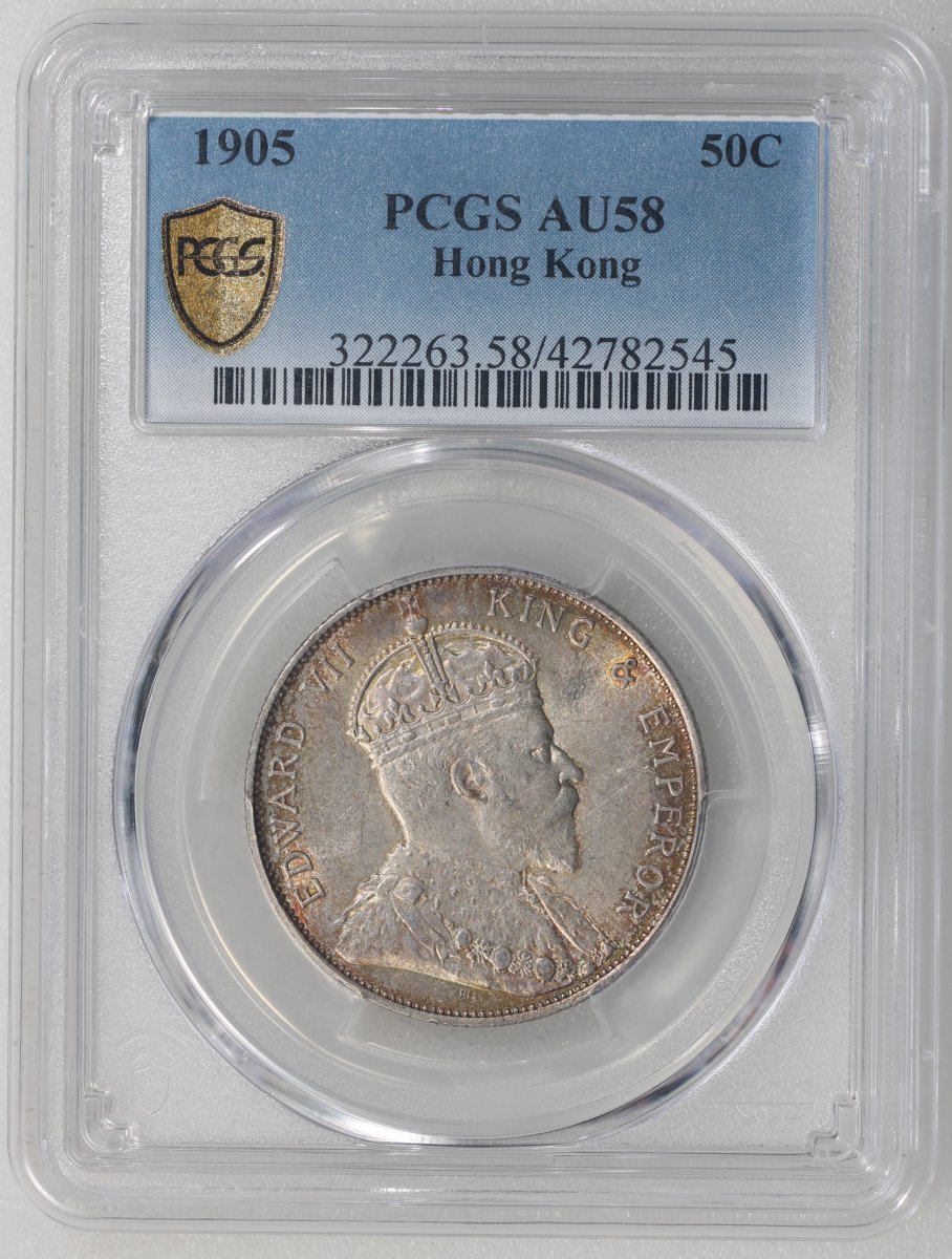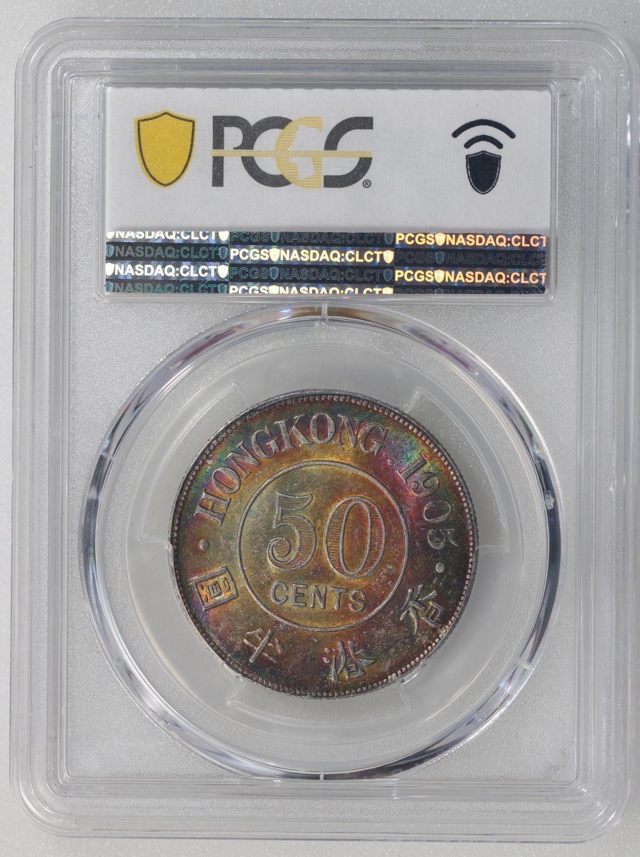 Hong Kong, silver 50 cents, 1905, PCGS AU58, #42782545, rainbow-colour toning on reverse