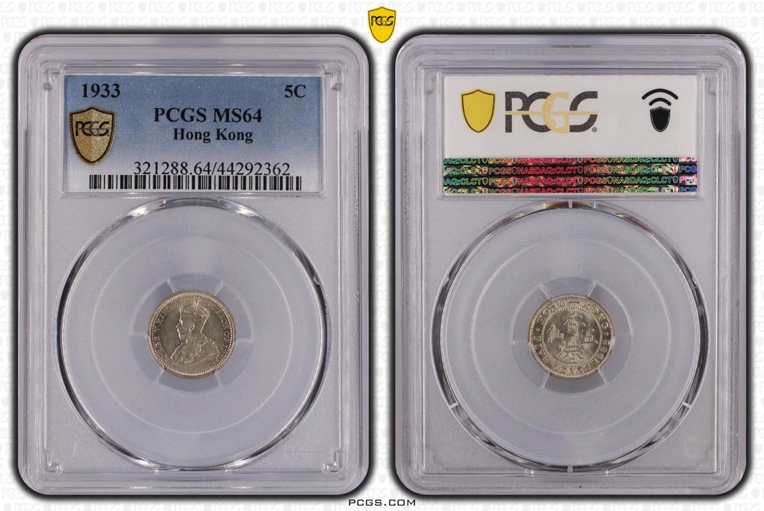 Hong Kong, silver 5 cents, 1933, PCGS MS64, #44292362
