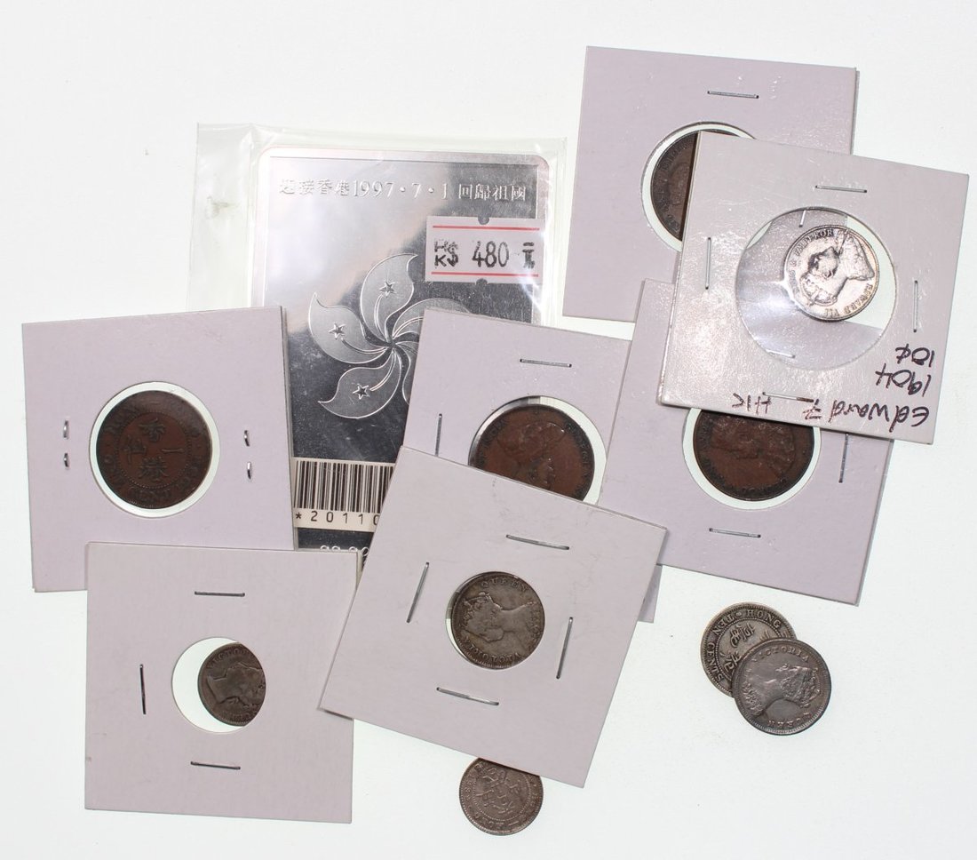 Hong Kong, group of 11, consisting of: 4x bronze 1 cent, 1931 (2) and 1933 (2), 2x silver 5 cents, 1892 and 1932, and 4x silver 10 cents, 1893, 1898, 1900 and 1904, also a commemorative silver medal for the Return of Hong Kong to China decorated as a calendar for the year of 1997,