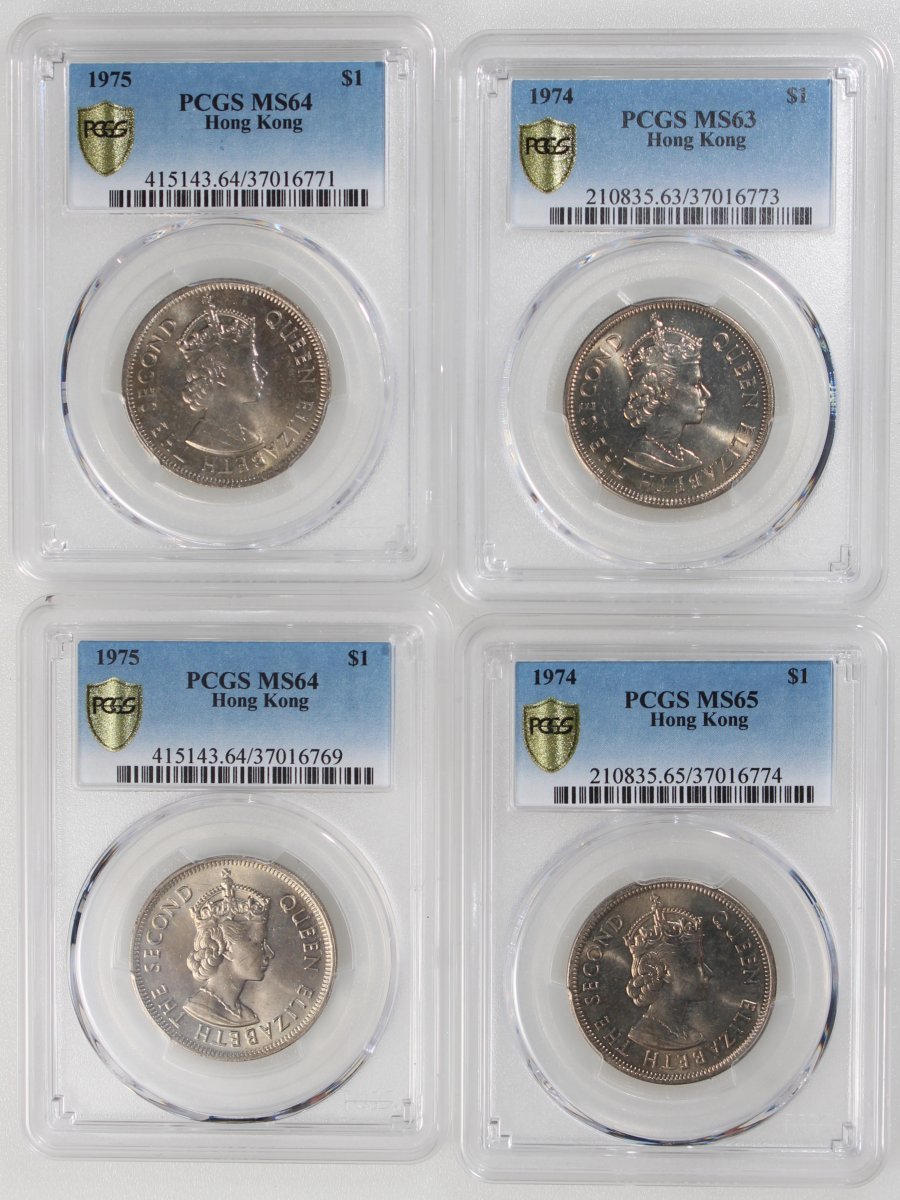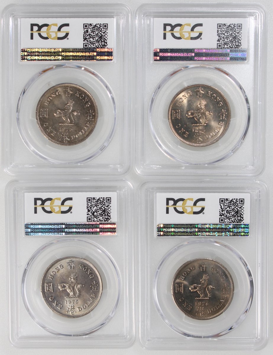 1974及75年香港1元一組4枚,各2枚,分別評PCGS MS63,MS65,MS64及MS64,#37016773,#37016774,#37016771,#337016769