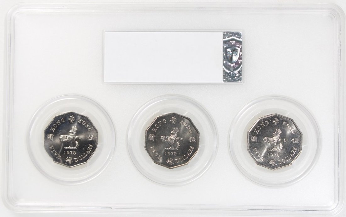 Hong Kong, trio of $5, 1976, 1978 and 1979, all graded PCGS MS 65 in one single holder (3 coins)