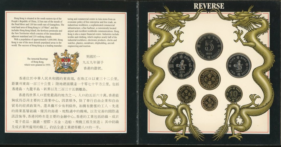1988年香港新鑄普通錢幣套裝一套7枚,5仙至5元,連原包裝