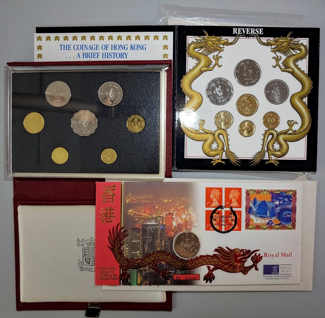 1988年香港紀念錢幣套裝2組,一為精鑄錢幣組,一為未流通錢幣組,及1997年五福臨門5元一枚,均原廠狀態或UNC,連原包裝