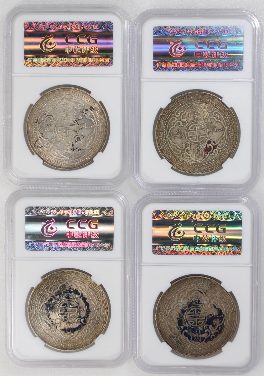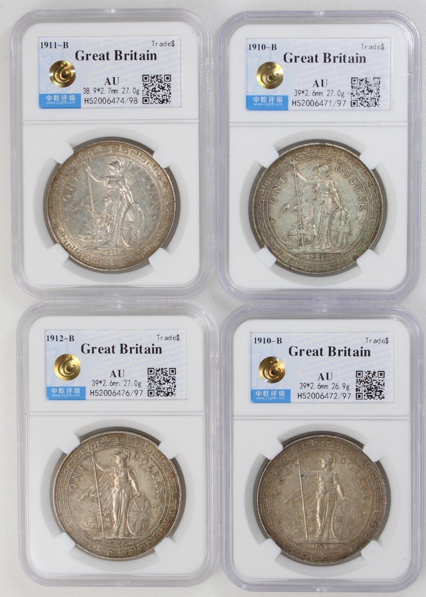 Great Britain, lot of 4 silver trade dollars, 1910-B (2), 1911-B and 1912-B, all graded by Zhong Qian AU (4)