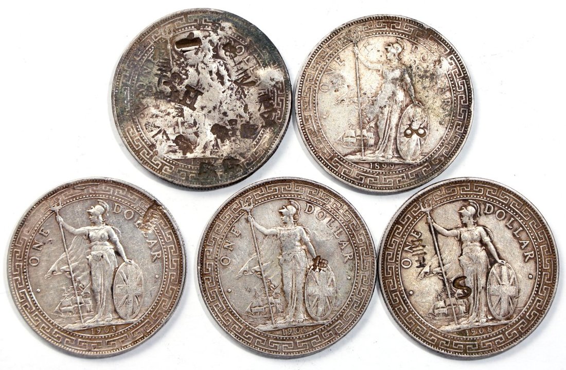 Great Britain, group of 5x silver trade dollars, 1899-B (2), 1903-B and 1908-B, fine or better. All chopmarked (6)