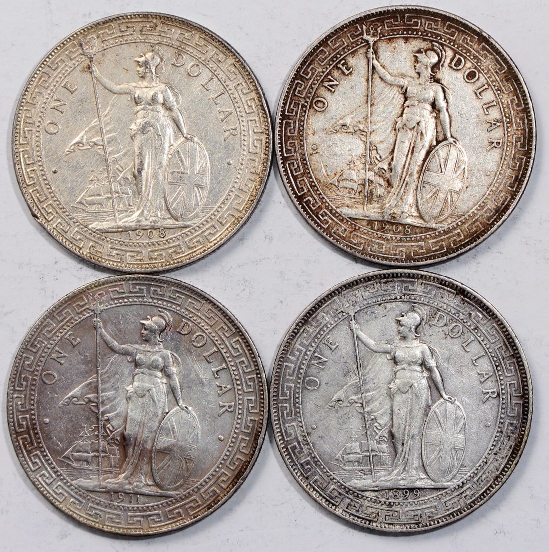 Great Britain, group of 4x silver trade dollar, 1899-B, 1908-B (2) and 1911-B, fine to very fine (4)