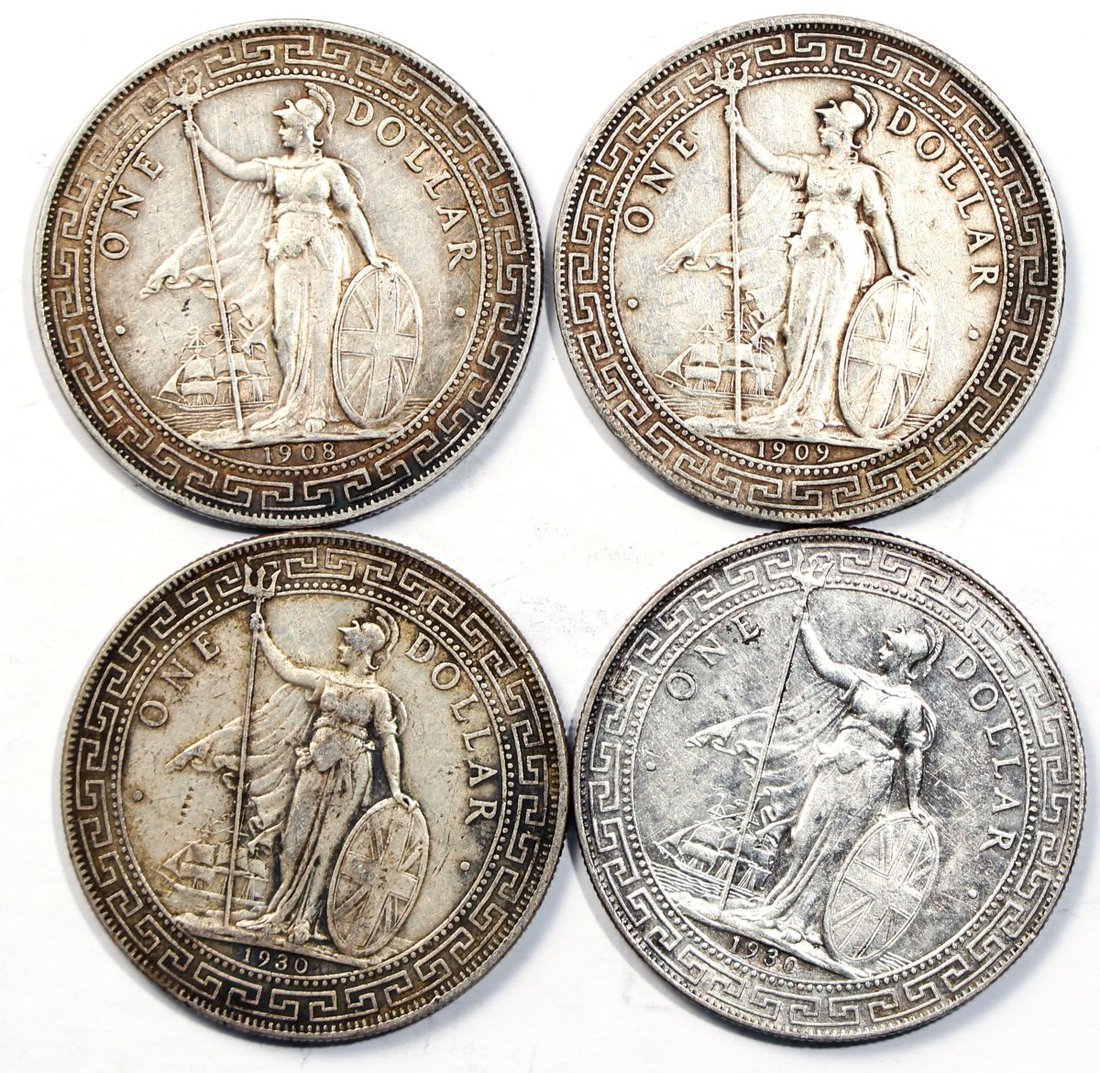 1908-B,1909-B,1930及1930-B英國貿易銀元一組4枚,F至VF
