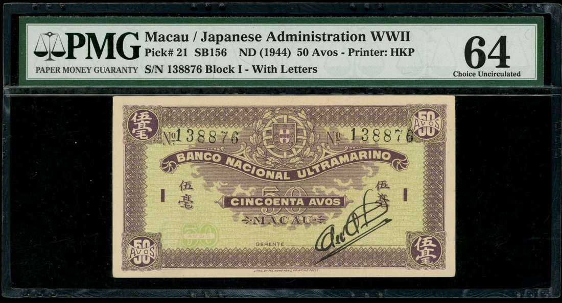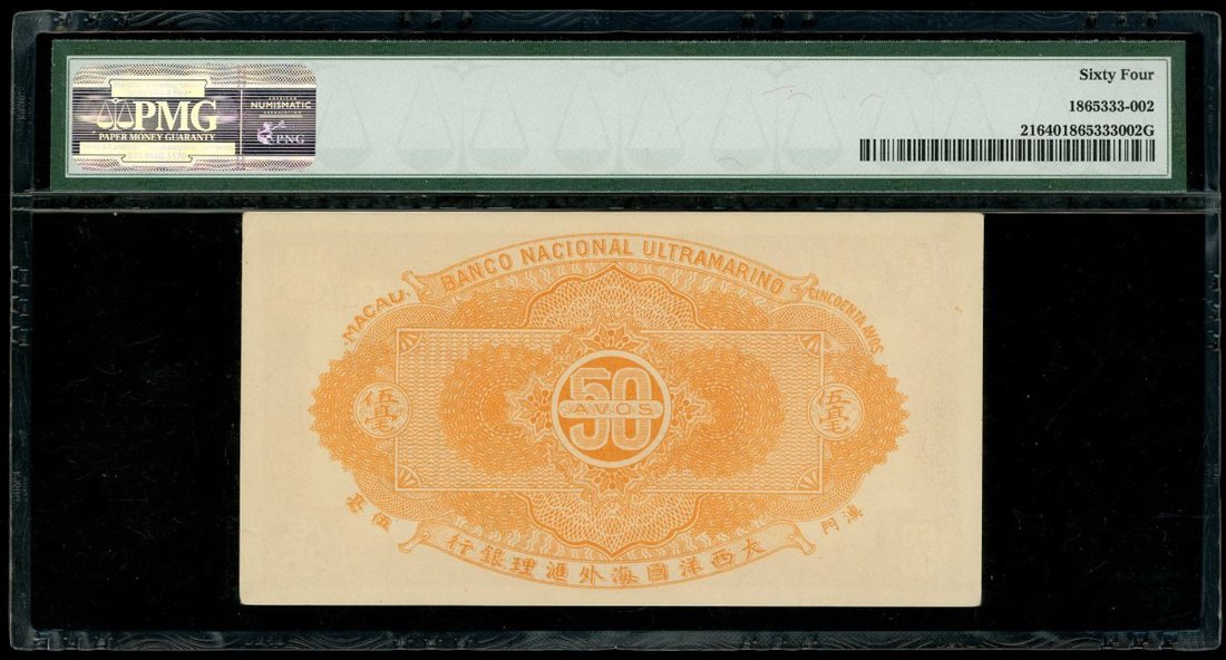 Macau: Banco Nacional Ultramarino, 50 avos, ND (1944), serial number 138876, (Pick 21), PMG 64 Choice Uncirculated