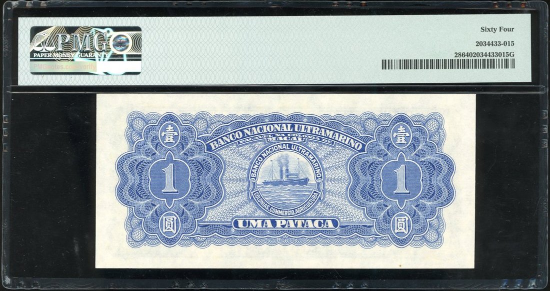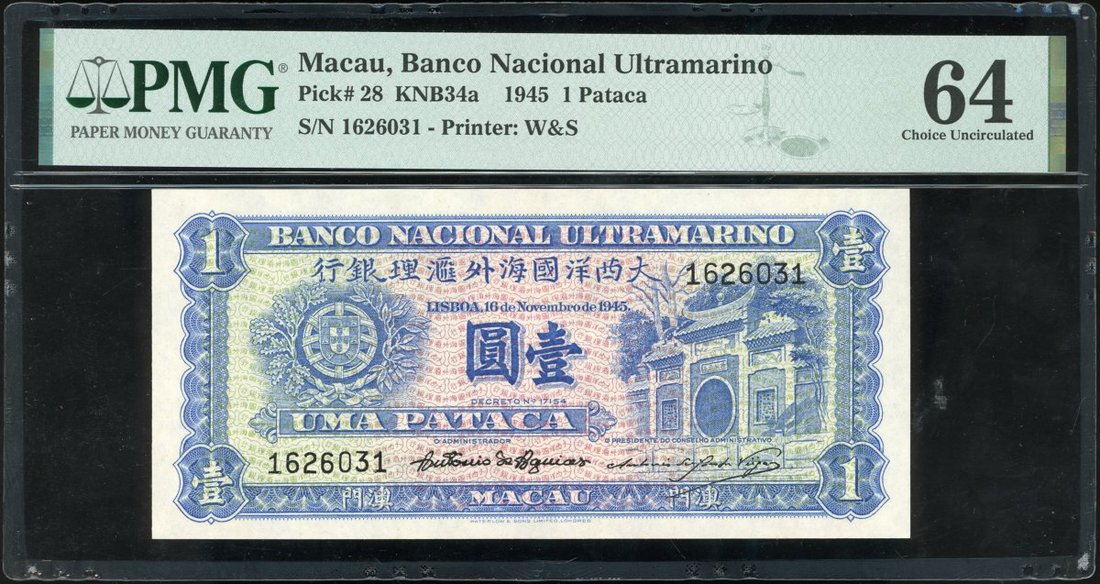 Macau: Banco Nacional Ultramarino, 1 Pataca, 1945, serial number 1626031, (Pick 28), PMG 64 Choice Uncirculated