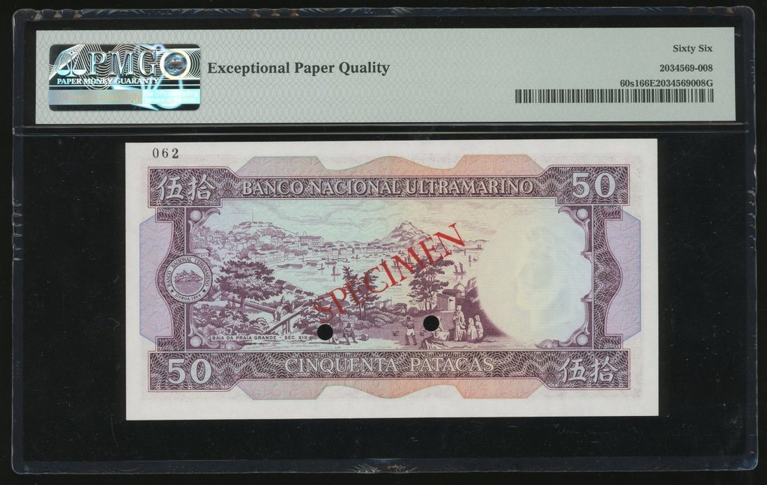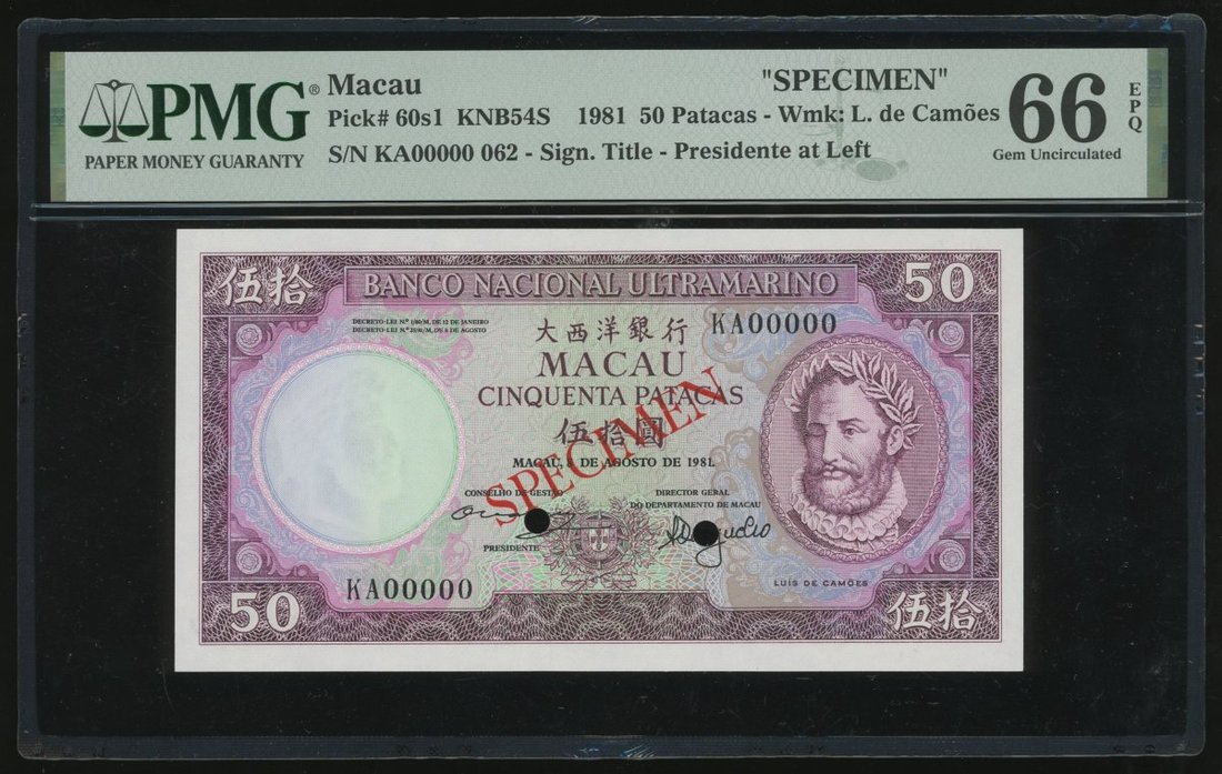 Macau, Banco Nacional Ultramarino, 50 patacas, specimen, 1981, serial number KA00000 062 (Pick 60s1), PMG 66EPQ Gem Uncirculated.
