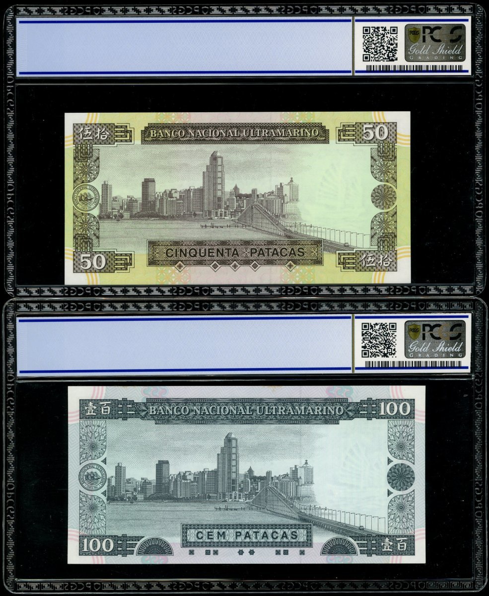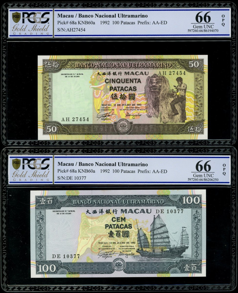 Macau, Banco Nacional Ultramarino, a pair of 50 patacas and 100 patacas, 1992, serial numbers AH 27454 and DE 10377, (Pick 67a and 68a), both graded PCGS Gold Shield Grading 66OPQ Gem UNC, 50 patacas is mislabeled as 100 patacas (2).