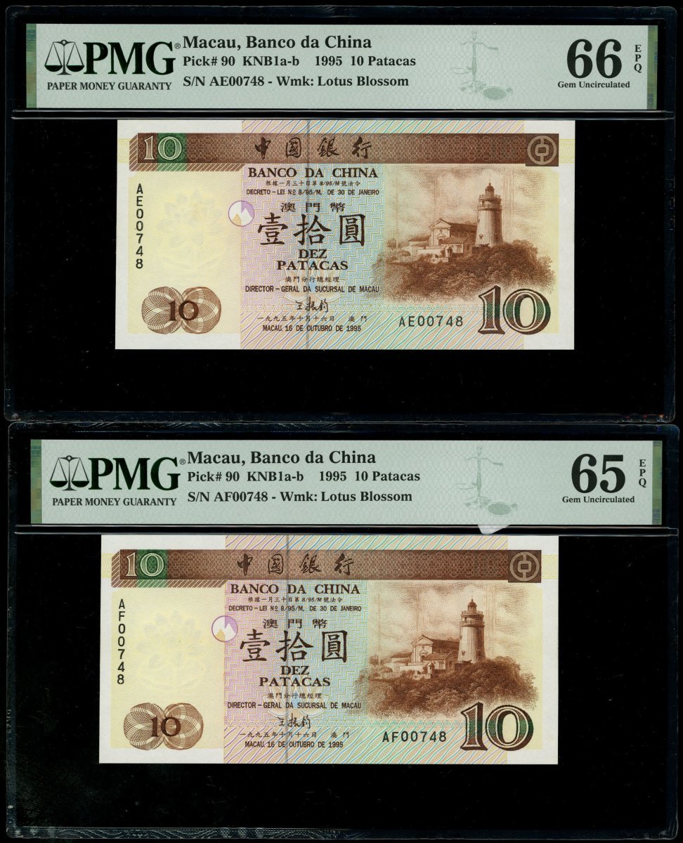 1995年澳門中國銀行10元一對,不同字軌相同編號AE00748及AF00748,分別評PMG 66EPQ及65EPQ
