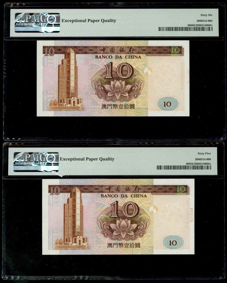 Banco Da China, a pair of 10 Patacas, 16.10.1995, matching serial numbers AE00748 and AF00748, (Pick 90), graded PMG 66EPQ and 65EPQ respectively (2)