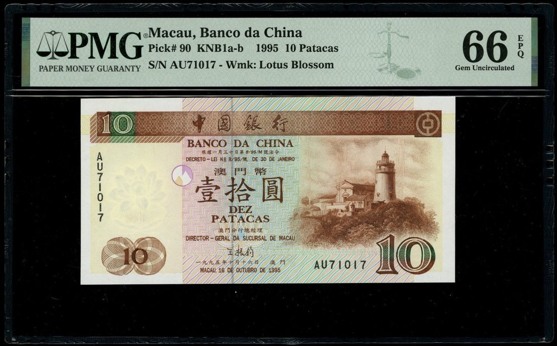 Banco Da China, 10 Patacas, 16.10.1995, radar serial number AU71017, (Pick 90), PMG 66EPQ Gem Uncirculated