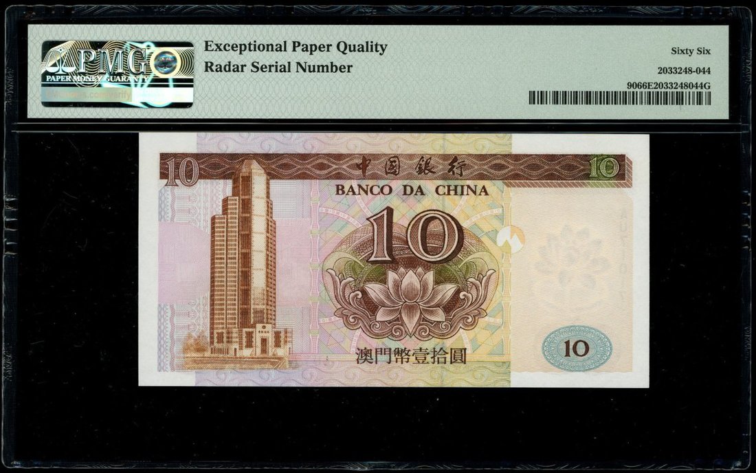 1995年澳門中國銀行10元,雷達號AU71017,PMG 66EPQ