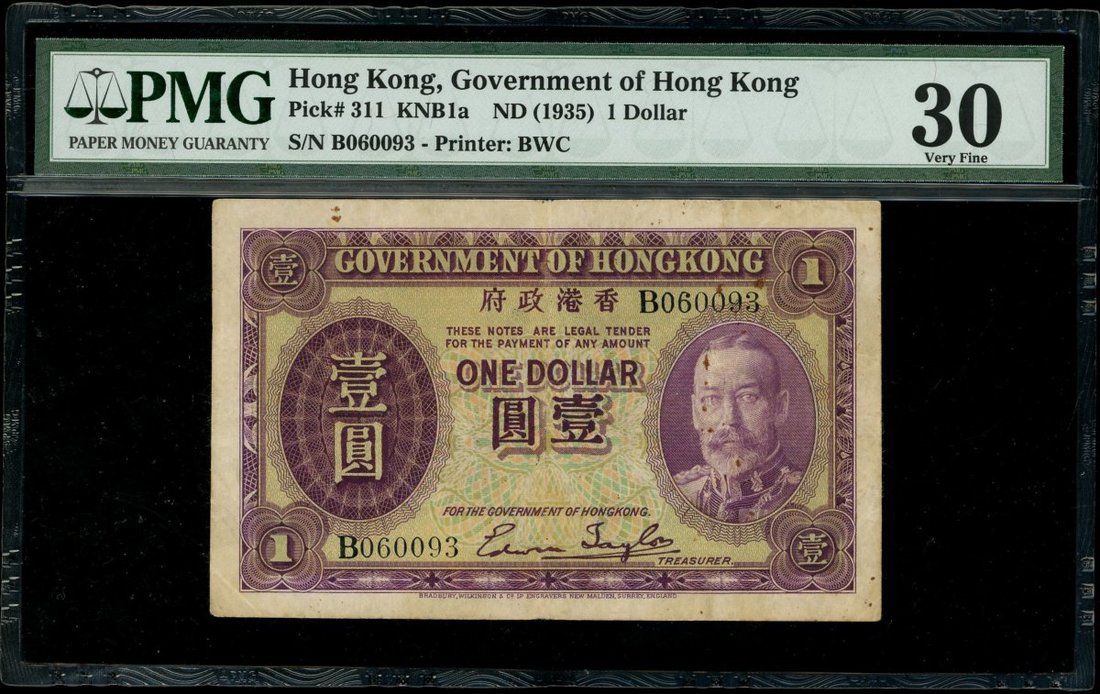 Government of Hong Kong, $1, 1935, serial number B060093, (Pick 311), PMG 30 Very Fine
