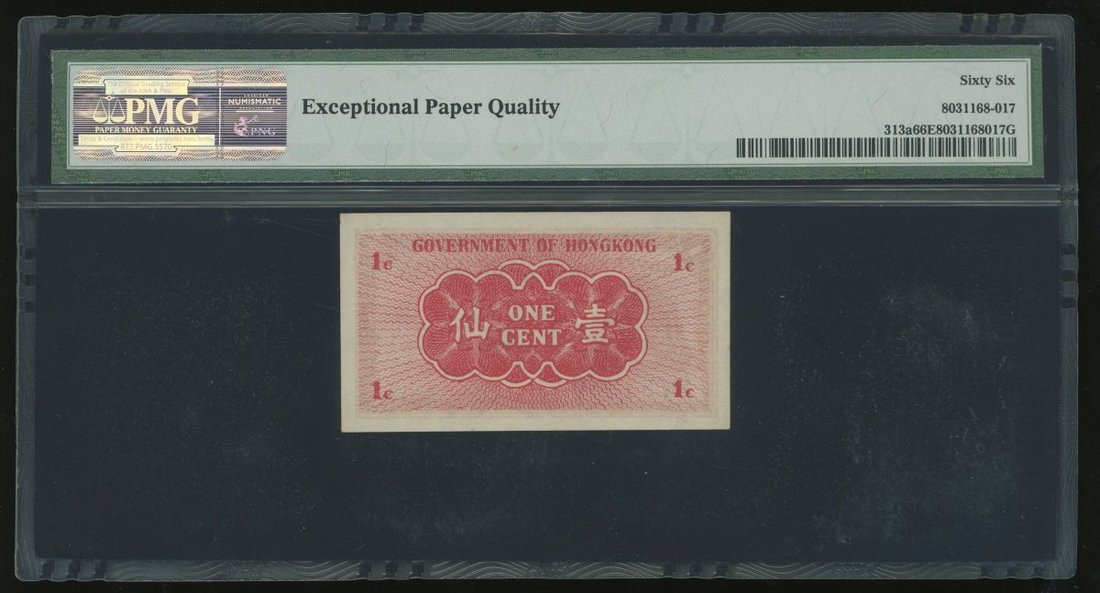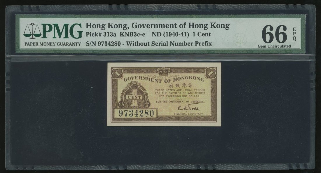 Hong Kong Government, 1 cent, ND(1940-41), serial number 9734280, (Pick 313a), PMG 66EPQ, gem uncirculated.