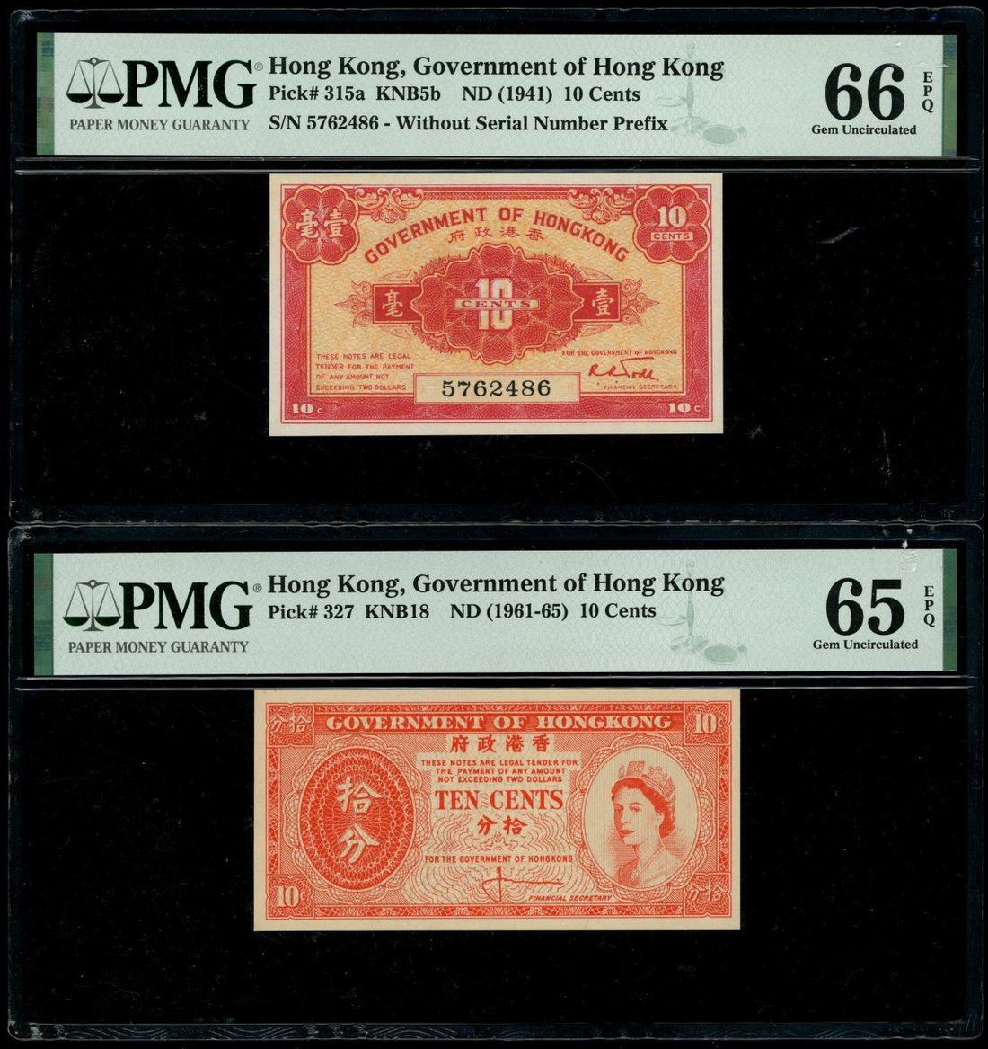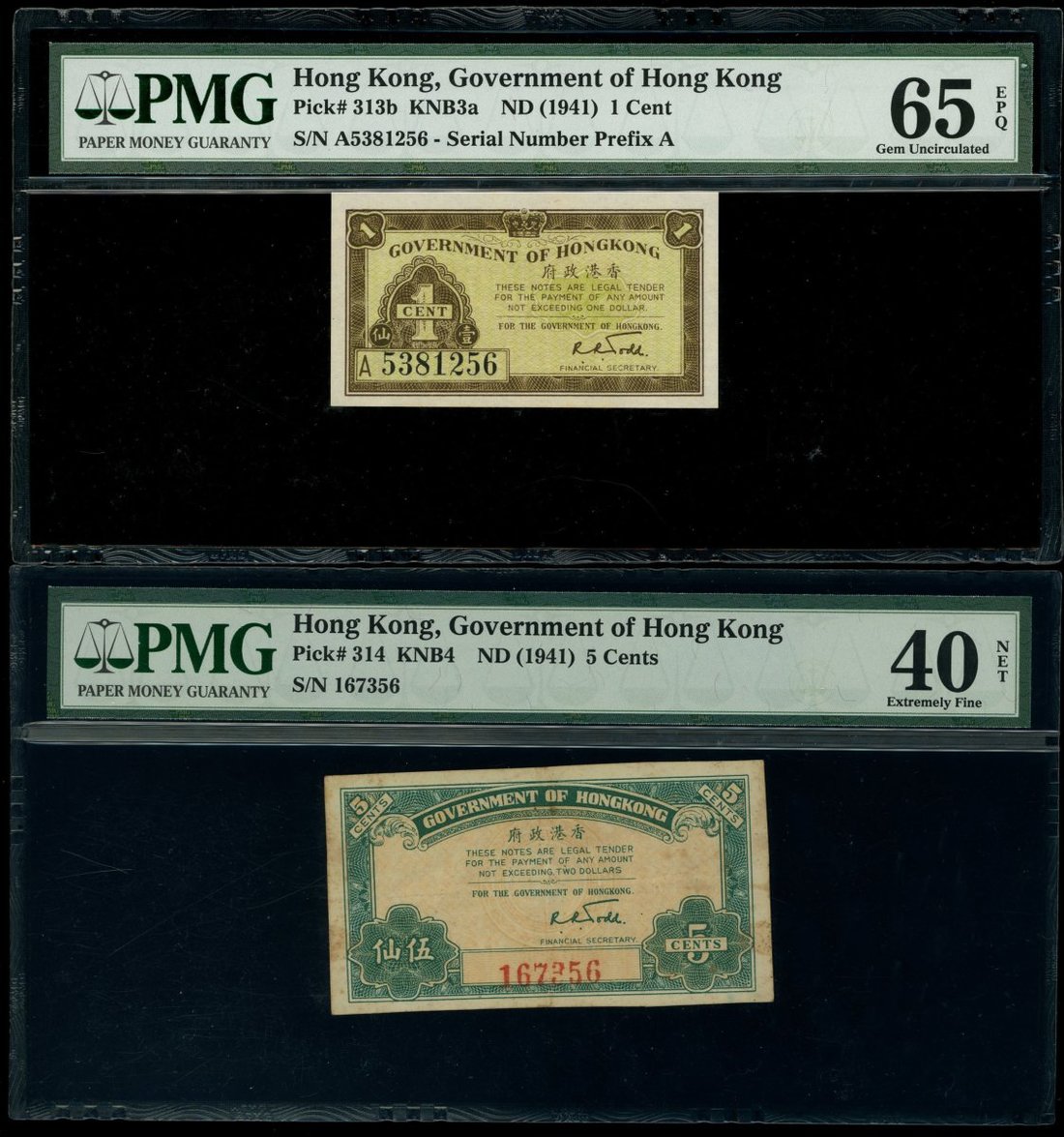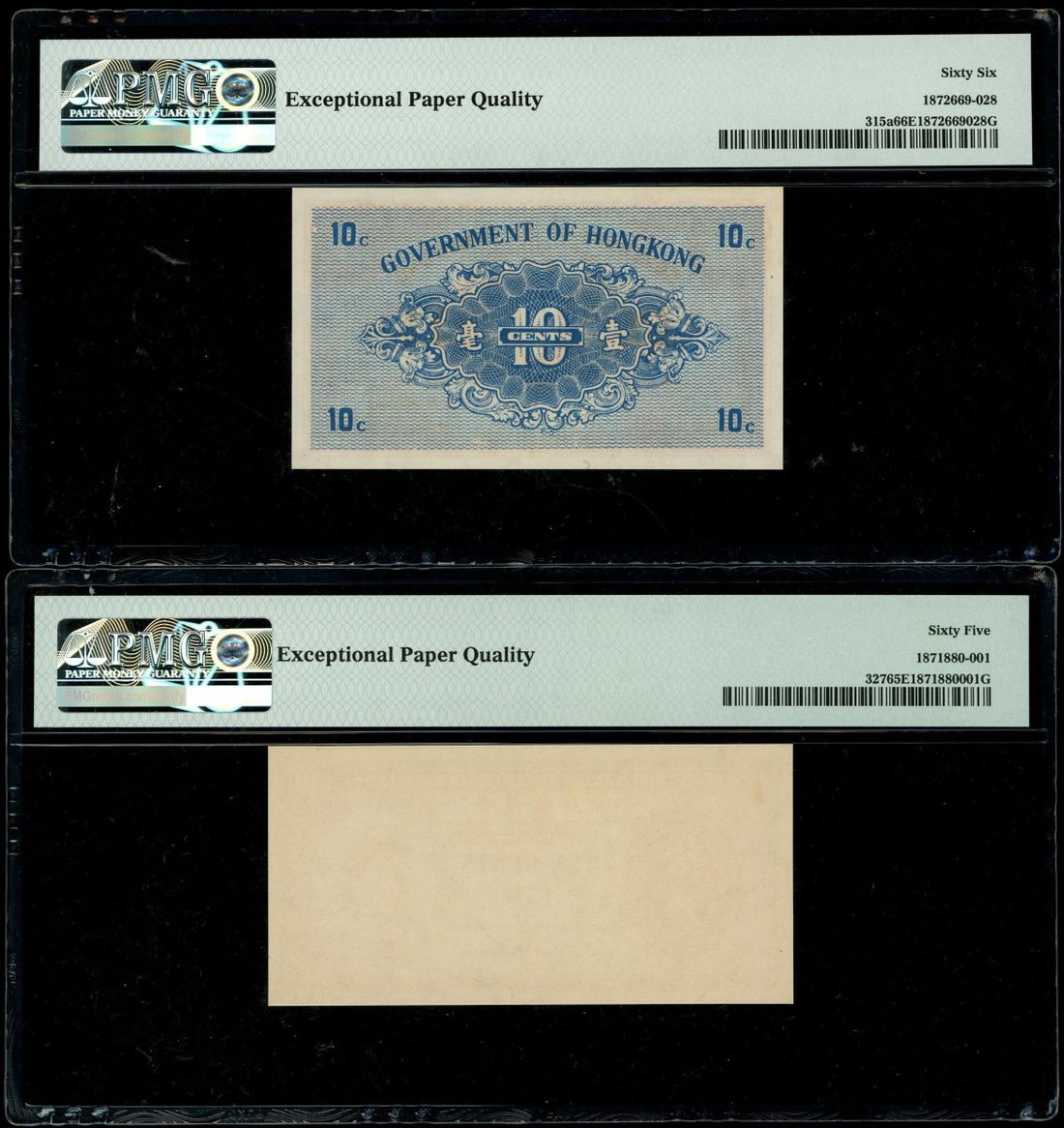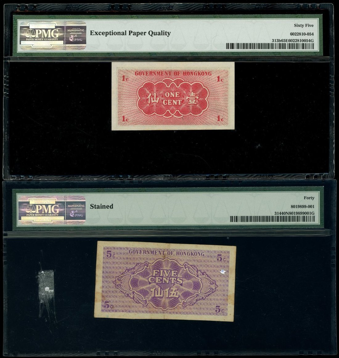 1941至1960年代香港政府角分鈔一組4枚,包括1941年1分,5分及1毫,及1961-65年1毫,分別評PMG 65EPQ,40NET (有漬),66EPQ及65EPQ