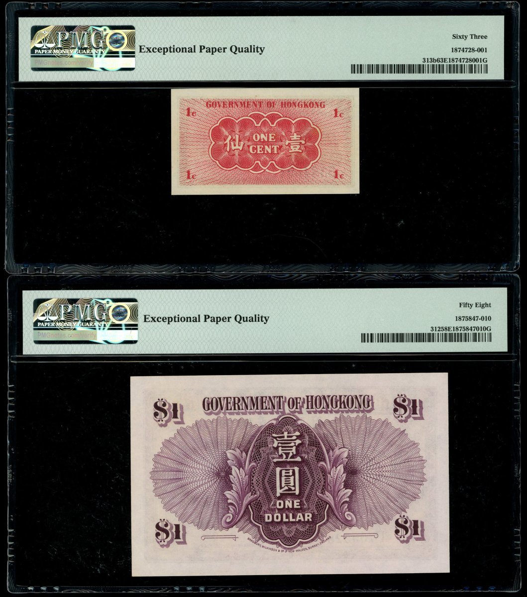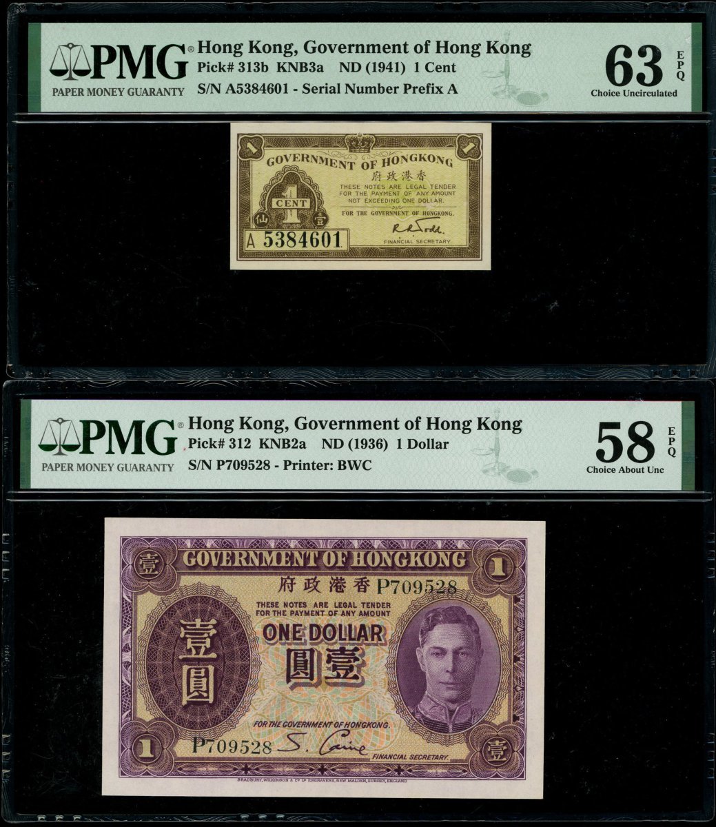Government of Hong Kong, lot of 2 notes, 1 cents, 1941, A5384601 and $1, 1936, P709528, (Pick 313b, 312), PMG 63EPQ and 58EPQ respectively (2)