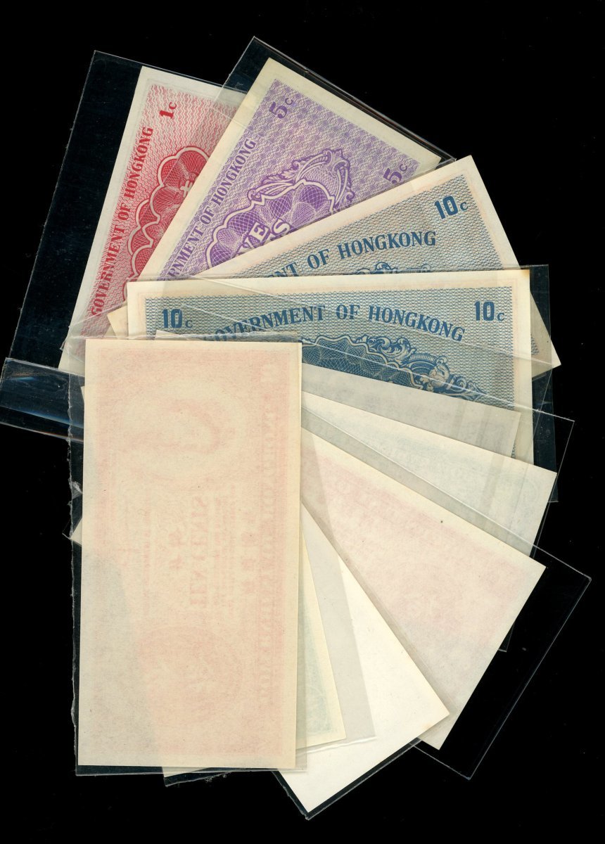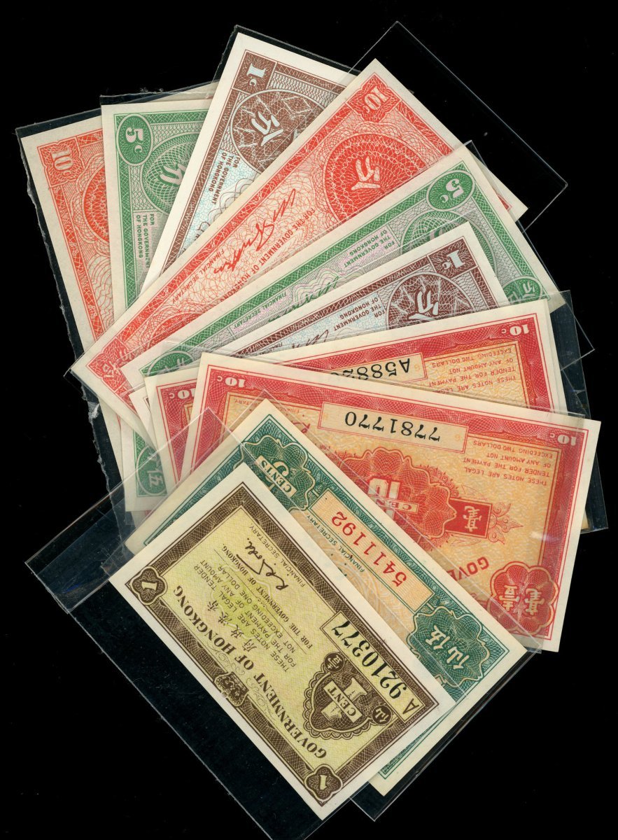 香港政府角分鈔一組10枚,包括1941年A字軌1仙,5仙,無字軌及A字軌1毫,1945年1仙,5仙及1毫,及1960-70年代英女皇1仙,5仙及1毫,均AU至UNC,本品涵蓋全套香港角分鈔版別,饒富趣味的一組