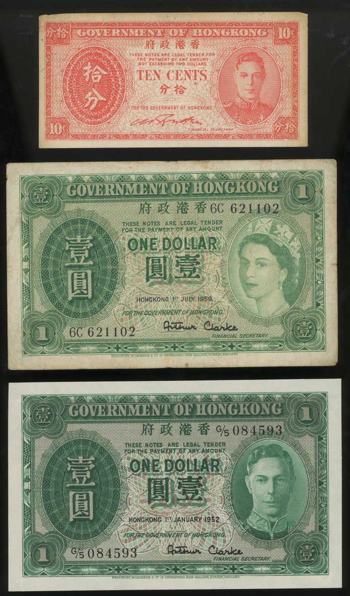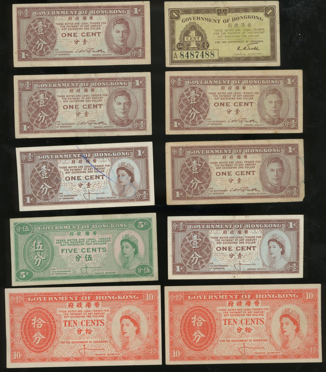 Government of Hong Kong, a group of 14x notes, consists of 1 cent (7), 5 cents, 10 cents(3), and $1(3), George VI and Elizabeth II issues,