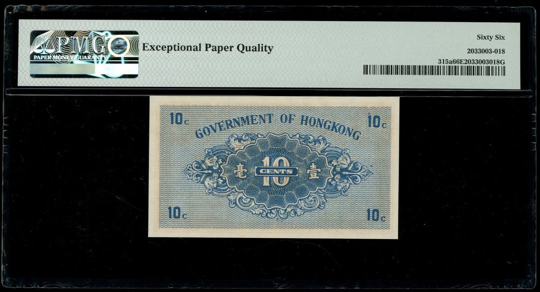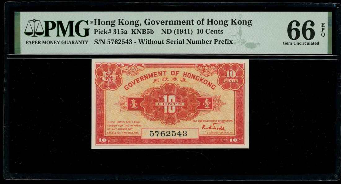 Government of Hong Kong, 10 cents, 1941, serial number 5762543, (Pick 315a), PMG 66EPQ Gem Uncirculated
