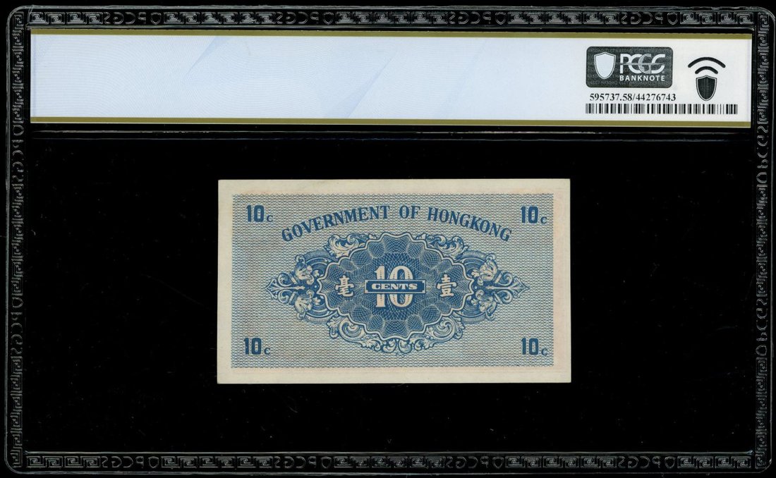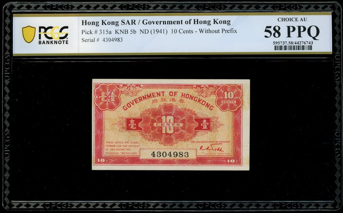 Government of Hongkong, 10 cents, ND (1941), ERROR NOTE, serial number 4304983, printing error on obverse, some details are double printed (Pick 315a), PCGS 58PPQ Choice AU, the error is apparent but is not explicitly stated on the grading label.