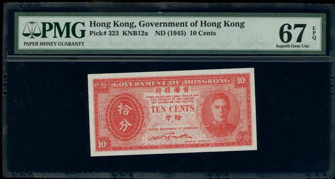 Government of Hongkong, 10 cents, ND (1945), (Pick 323), PMG 67EPQ Superb Gem Uncirculated