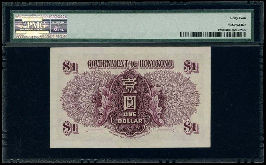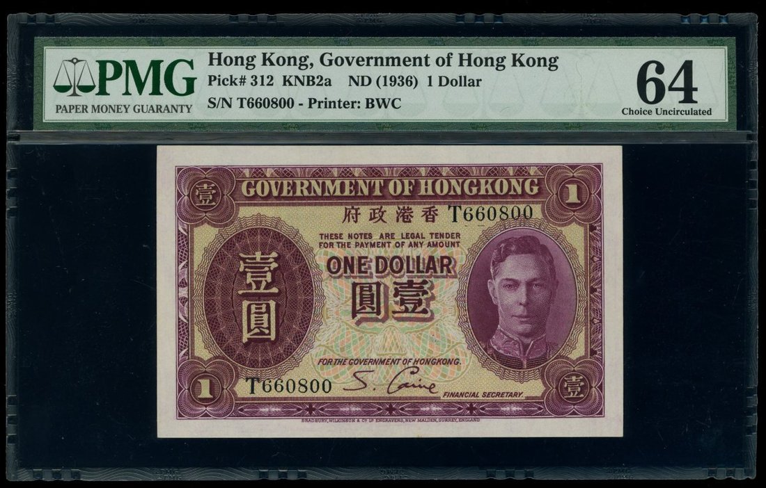1936年香港政府1元,無日期,編號T660800,PMG 64