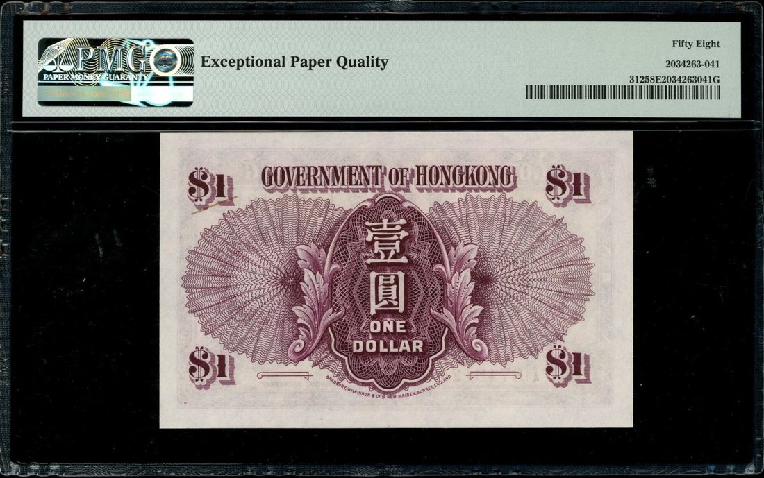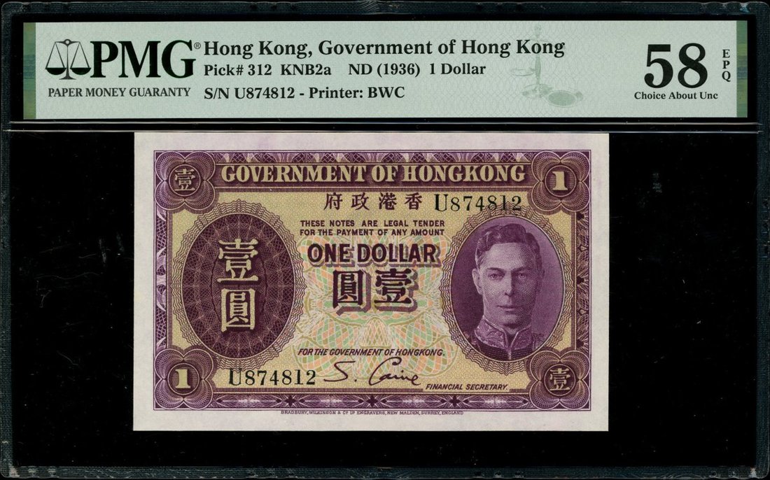 Hong Kong Government, $1, ND(1936), serial number U874812, (Pick 312), PMG 58EPQ, choice about uncirculated.
