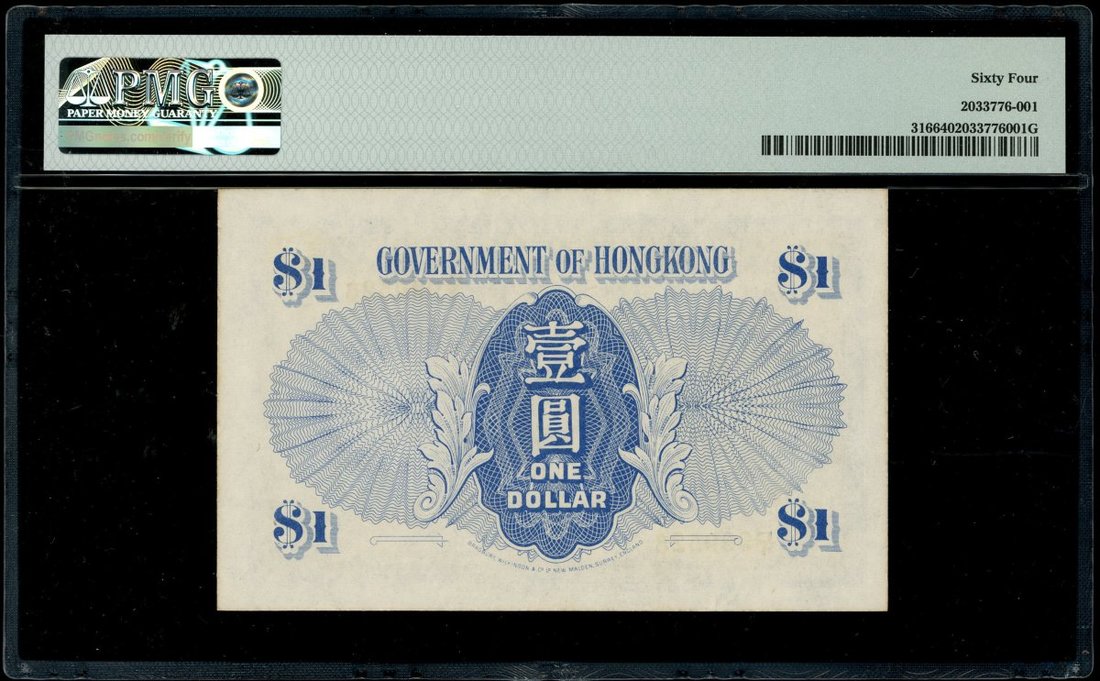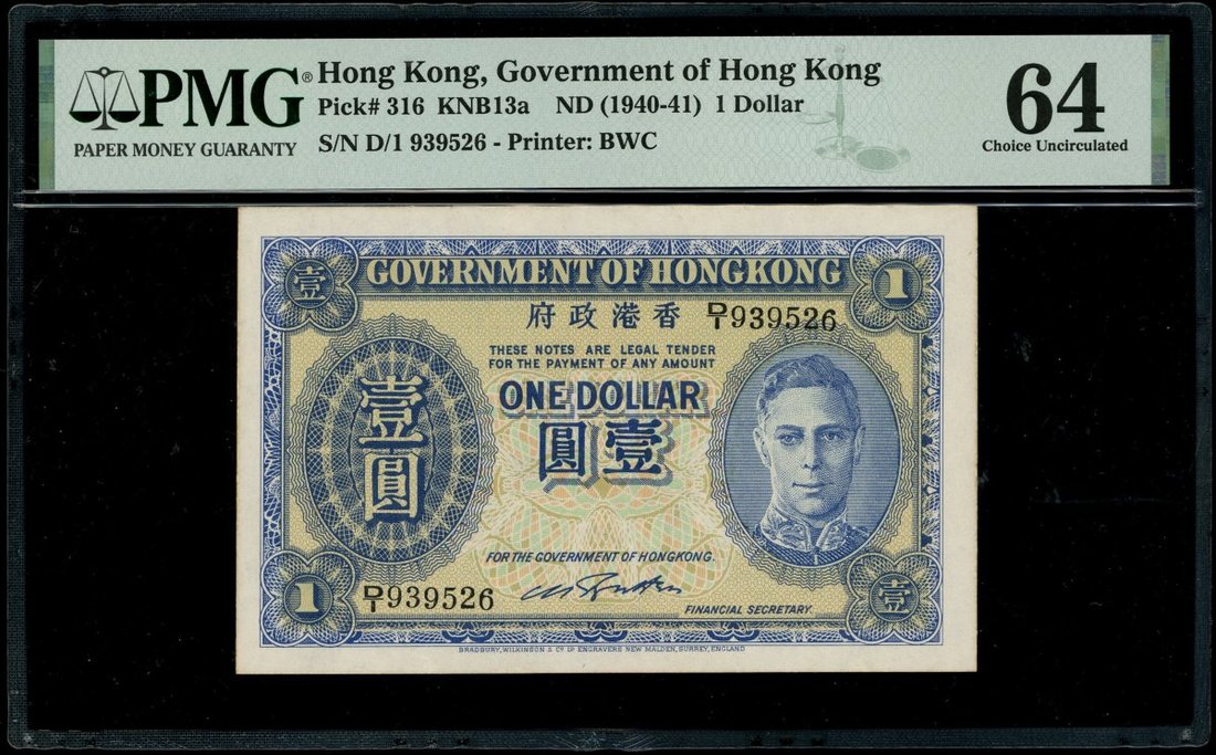 Government of Hongkong, $1, ND (1940-1941), serial number D/1 939526, (Pick 316), PMG 64 Choice Uncirculated, edge toning.