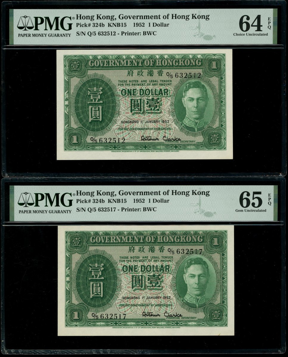 Government of Hong Kong, a pair of $1, 1.1.1952, serial numbers Q/5 632512 and 517 (Pick 324b), graded PMG 64EPQ and 65EPQ respectively (2).