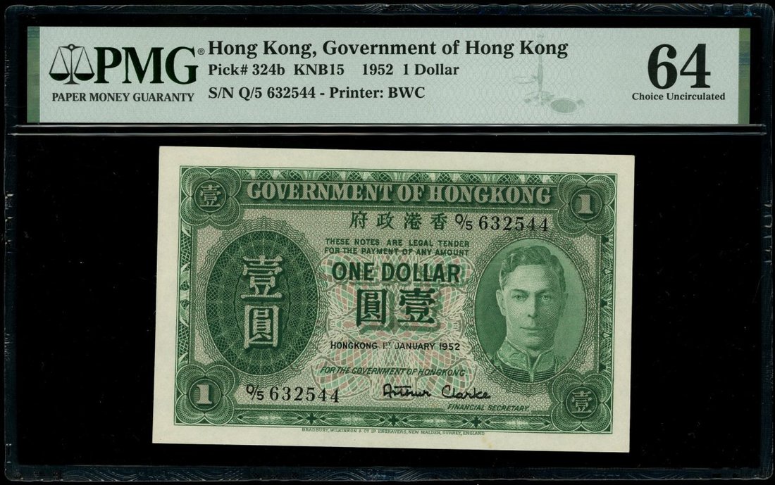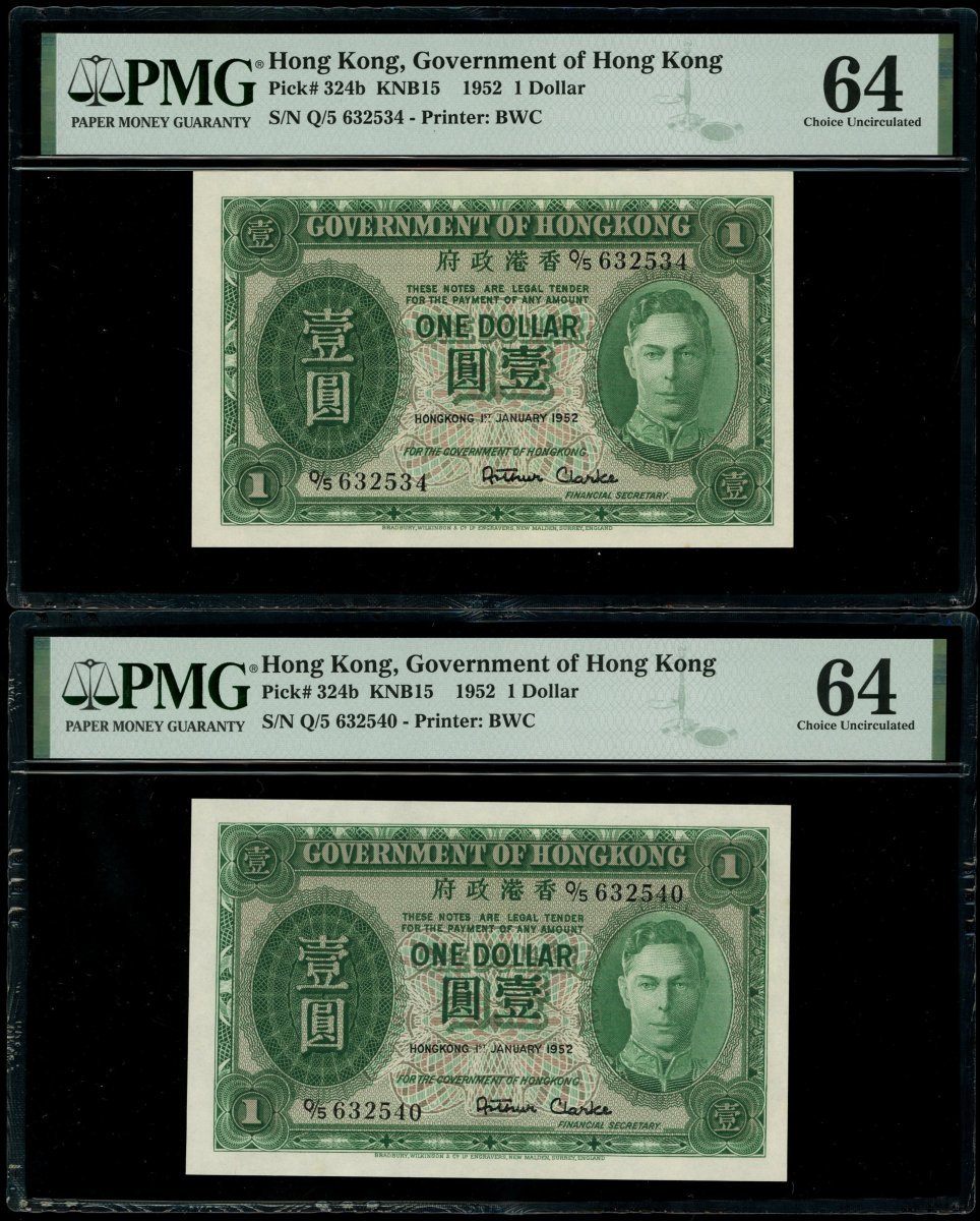 1952年香港政府1元一組5枚,編號Q/5 632534,540-541,543-544,PMG 64-64EPQ