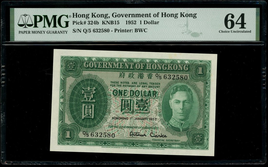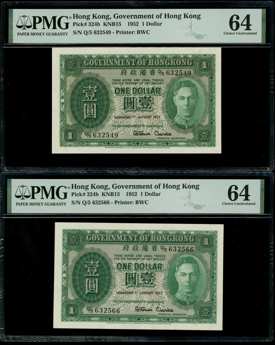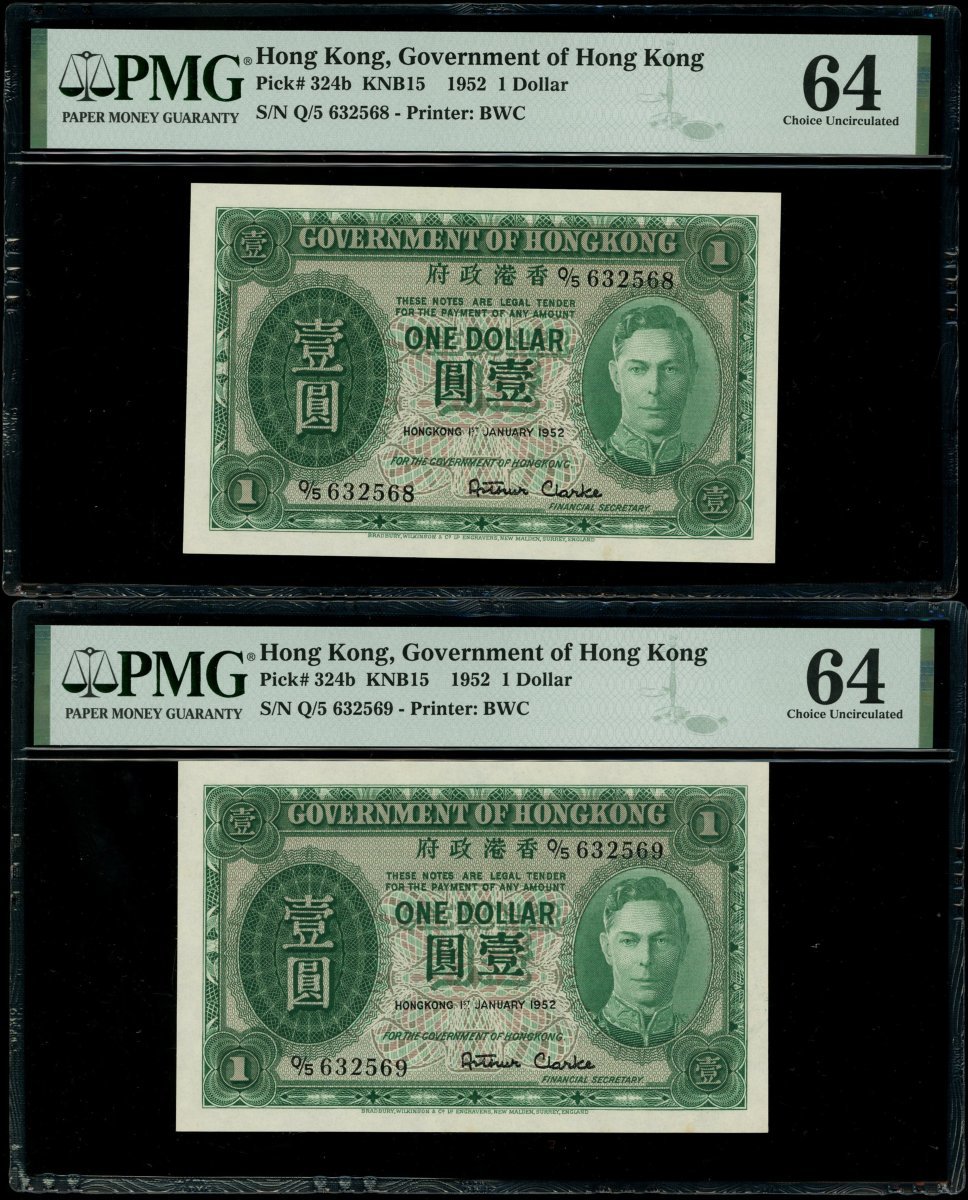 Government of Hong Kong, a group of 5x $1, 1.1.1952, serial numbers Q/5 632549, 566, 567-569 and 580, (Pick 324b), all graded PMG 64 Choice Uncirculated (5).