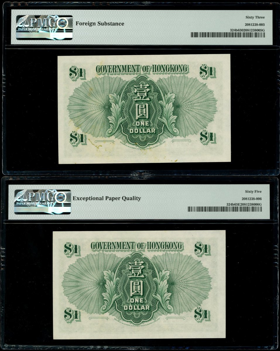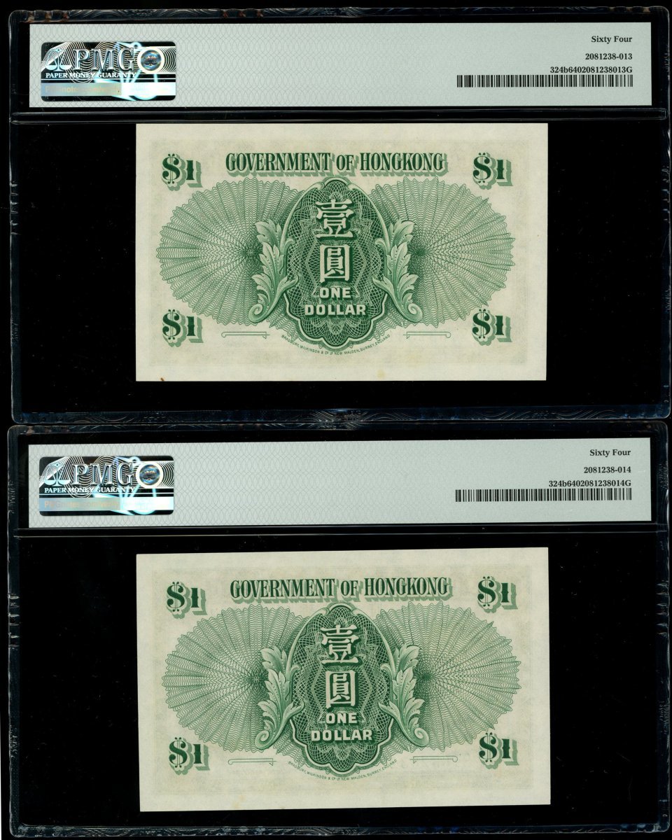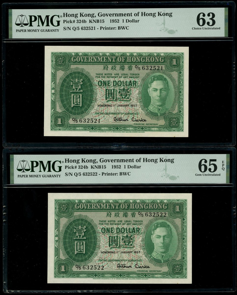 Government of Hong Kong, a group of 5x $1, 1.1.1952, serial numbers Q/5 632521-522, 531-533, (Pick 324b), graded PMG 63, 65EPQ, 64, 64 and 64 respectively (5).