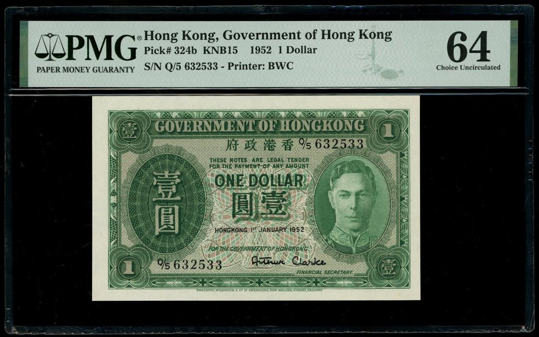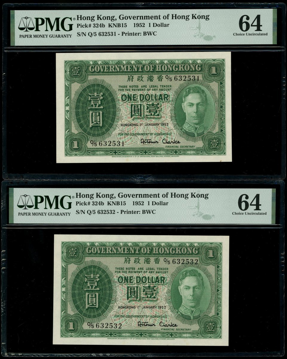 1952年香港政府1元一組5枚,編號Q/5 632521-522,531-533,分別評PMG 63,65EPQ,64,64及64