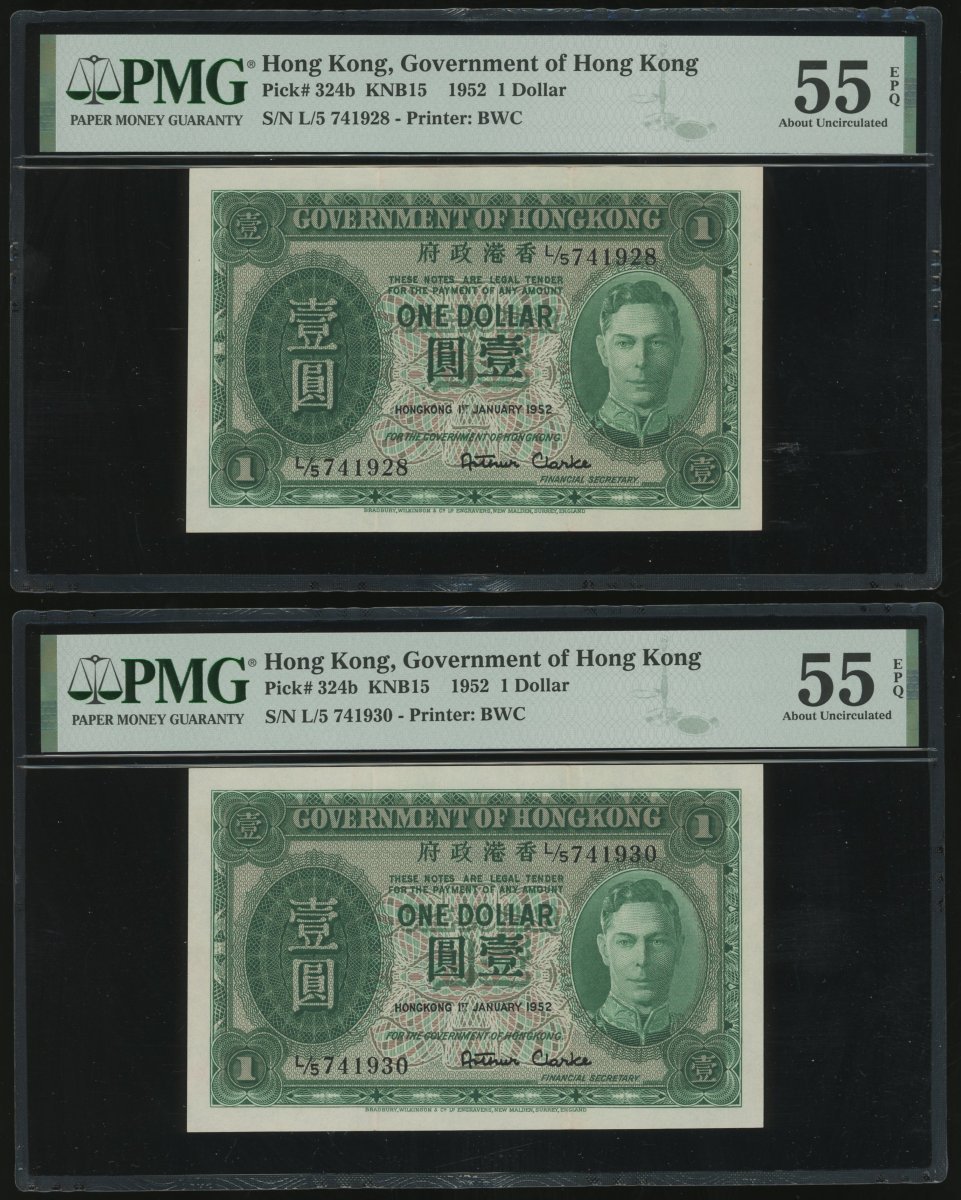 Government of Hongkong, a pair of $1, 1.1.1952, close serial numbers l/5 741928 and 930, (Pick 324b), both graded PMG 55EPQ About Uncirculated (2)