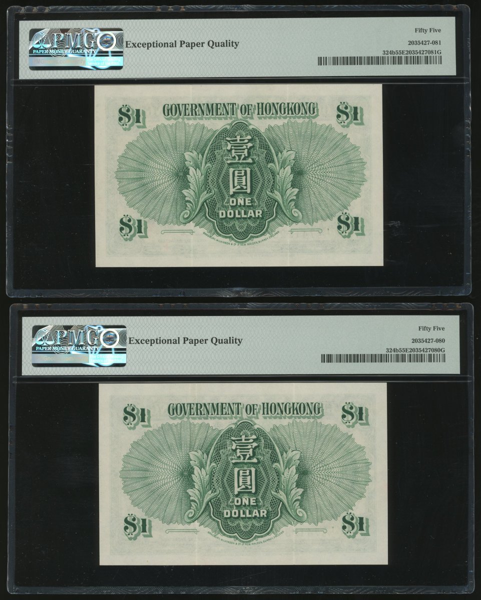 1952年香港政府1元一對,相近編號l/5 741928及930,均評PMG 55EPQ