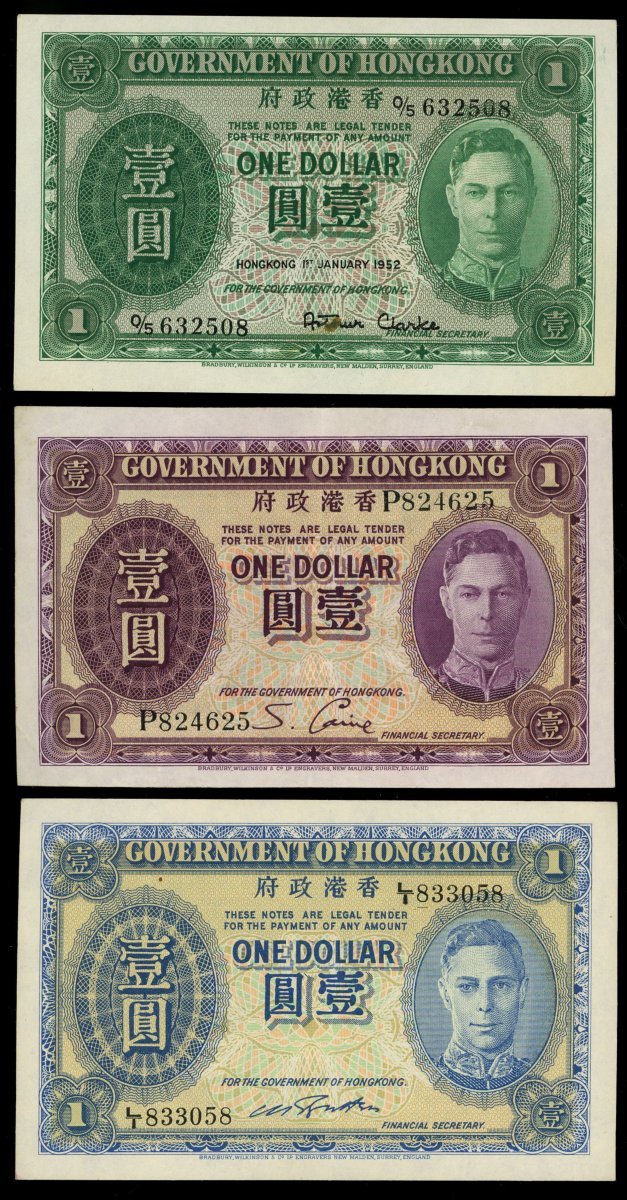 1936年香港政府1元一組3枚,包括1936年,1940-41年及1952年版別,編號P824625,L/I 833058及Q/5 632508,不同之喬治六世版別,AU,有微黃