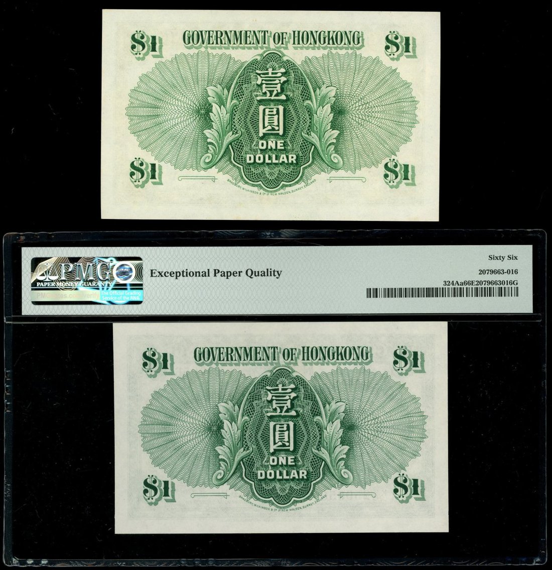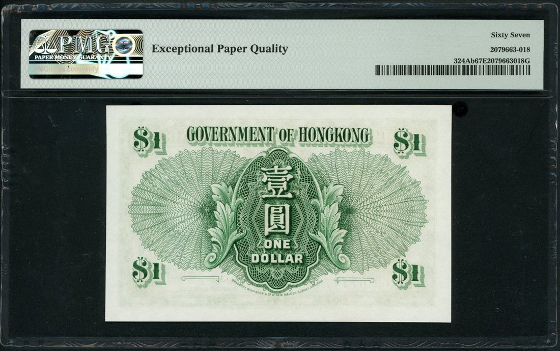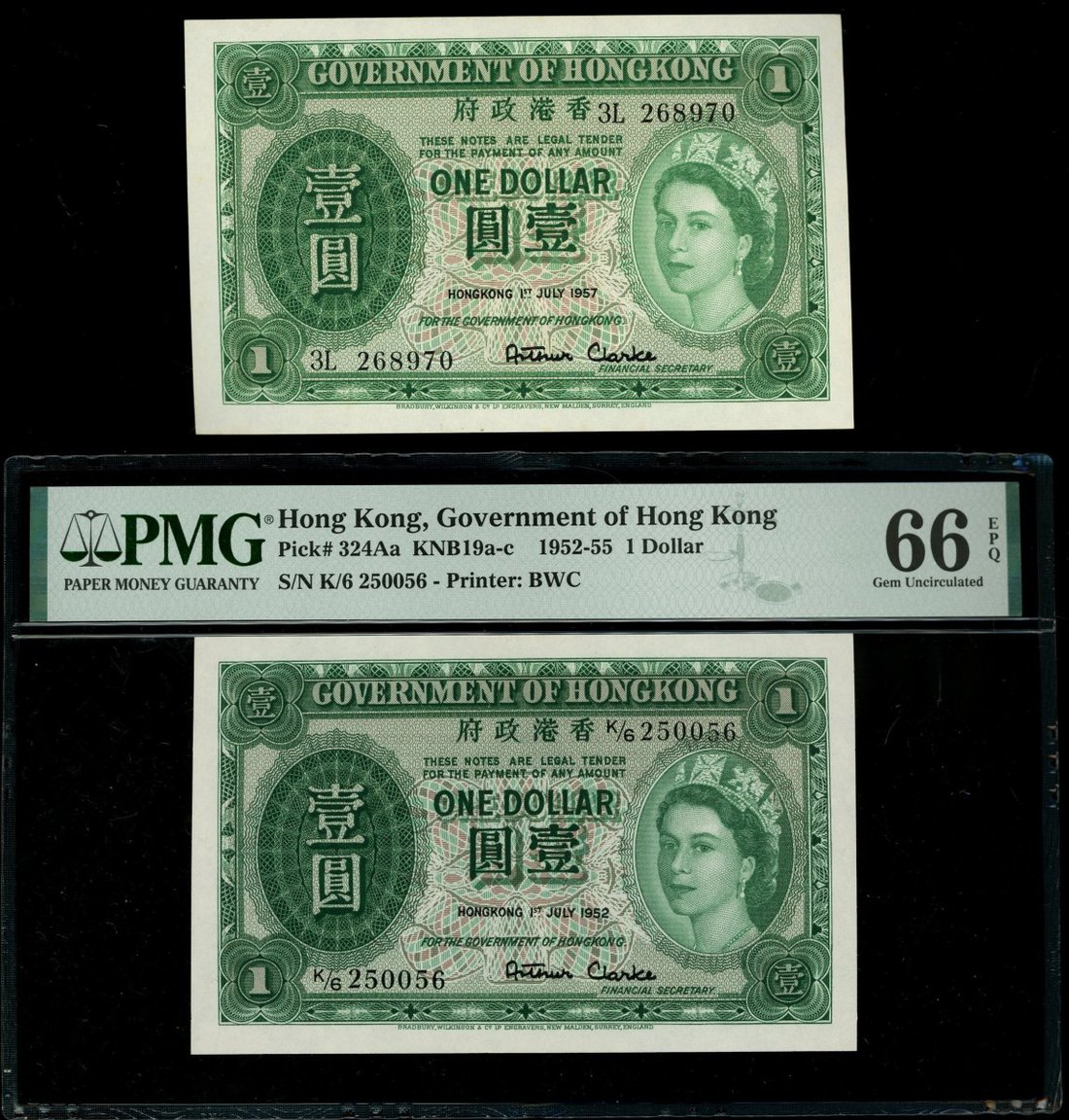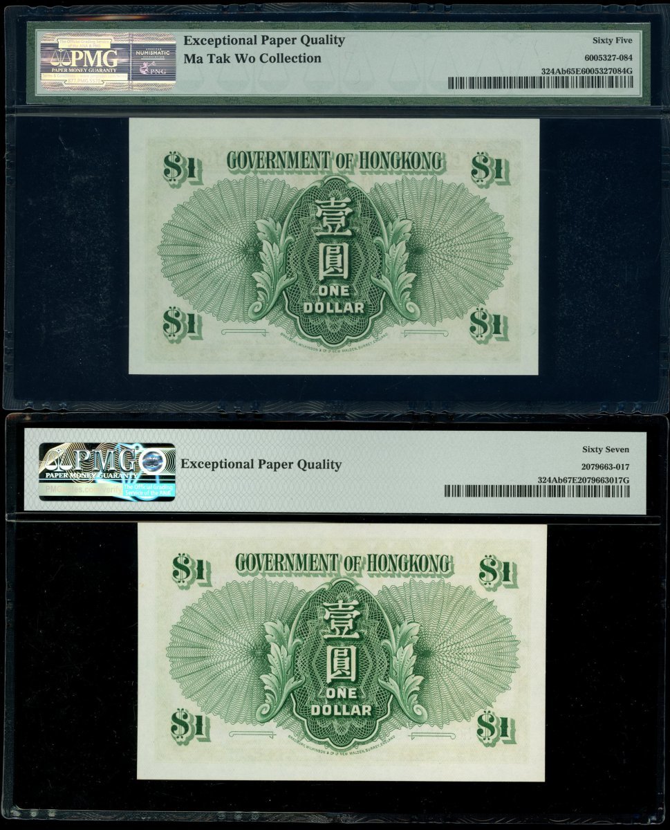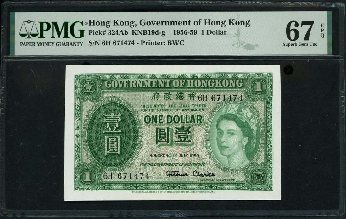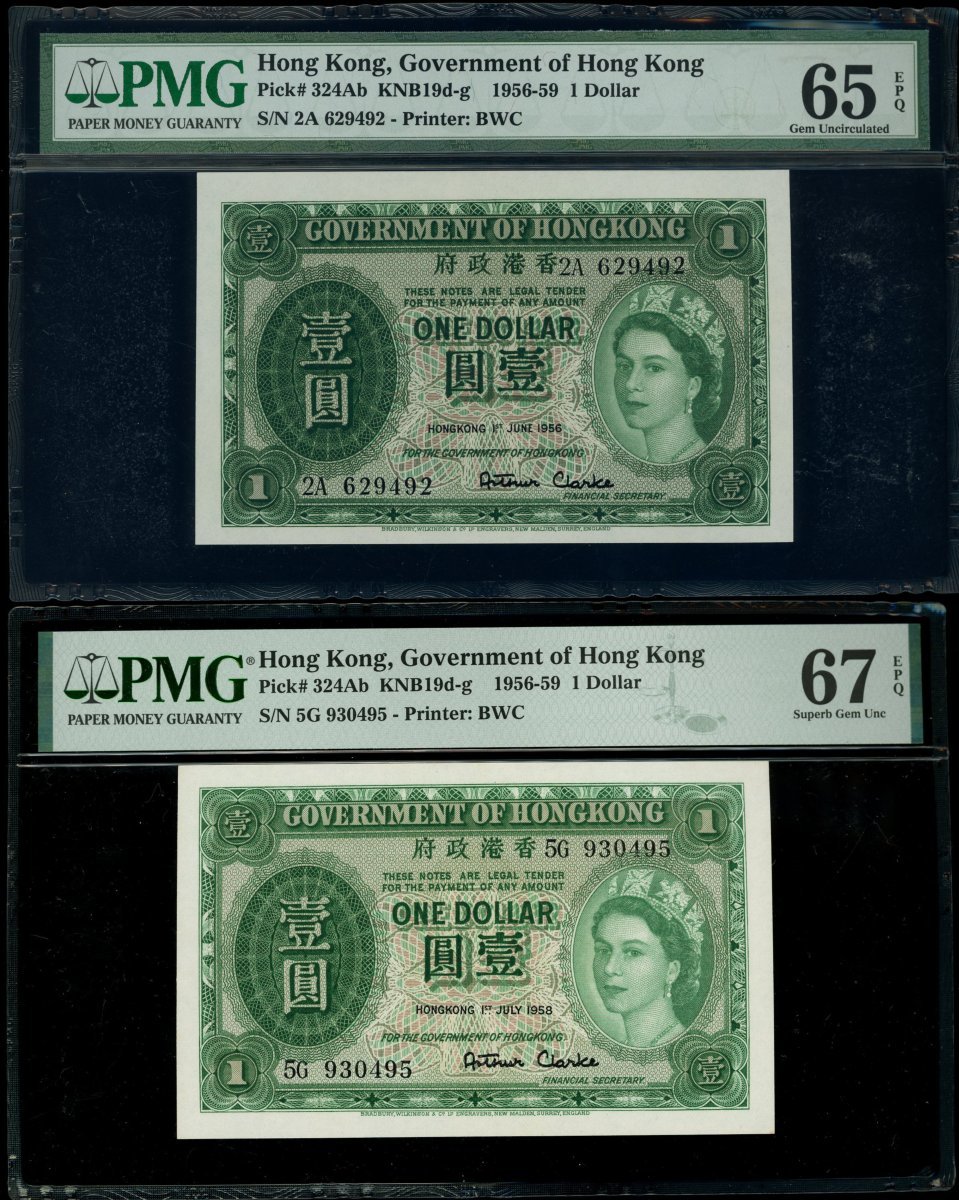 Hong Kong Government, a quintet of $1, 1952, 1956-59, serial number K/6 250056, 2A 629492, 3L 268970, 5G 930495 and 6H 671474, (Pick 324Aa, 324Ab), the 1957 with mild foxing, uncirculated, the rest graded with PMG 66, 65, 67 and 67 EPQ respectively.(5) The plastic holders were bent but not affect the banknote inside.