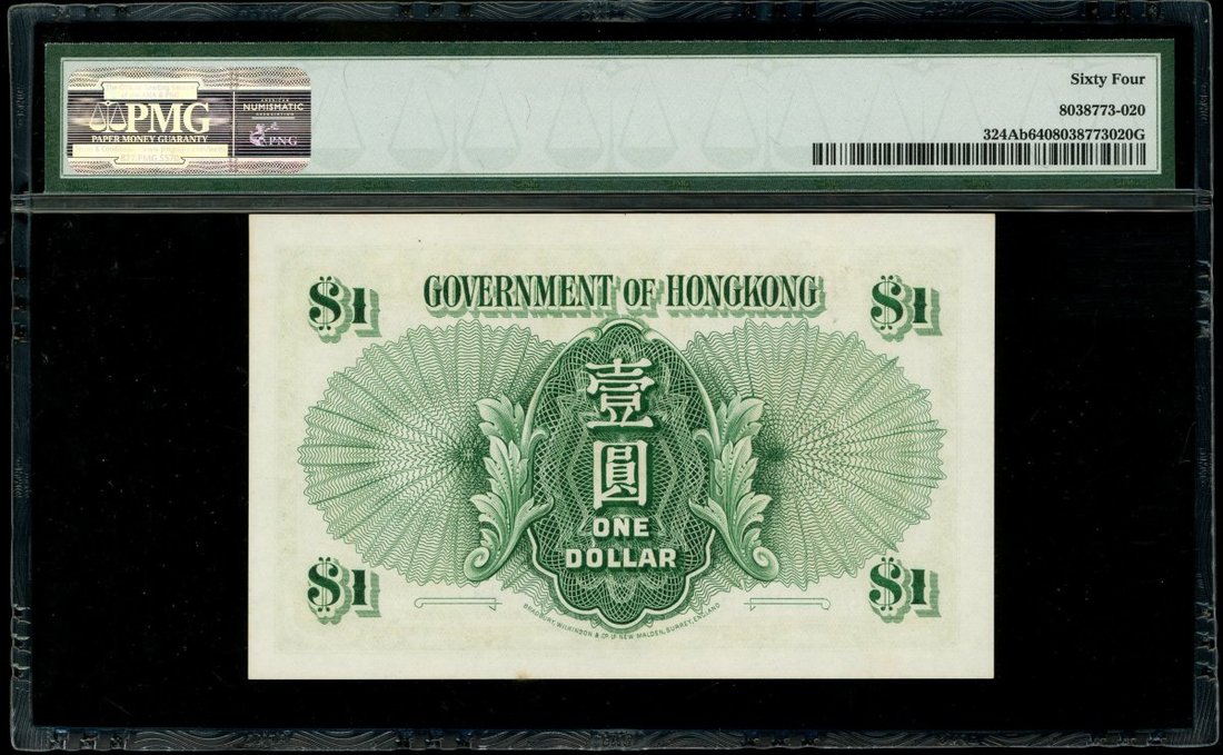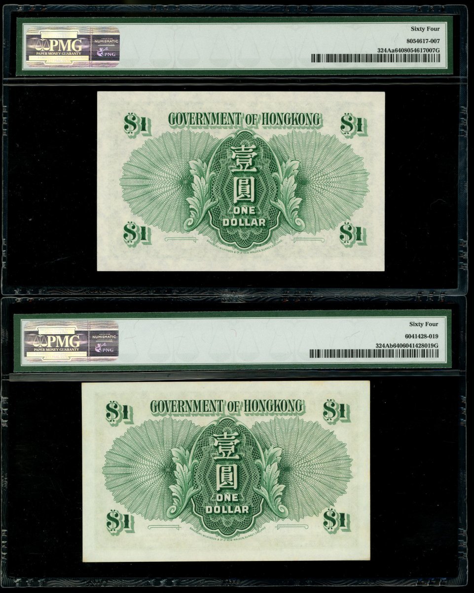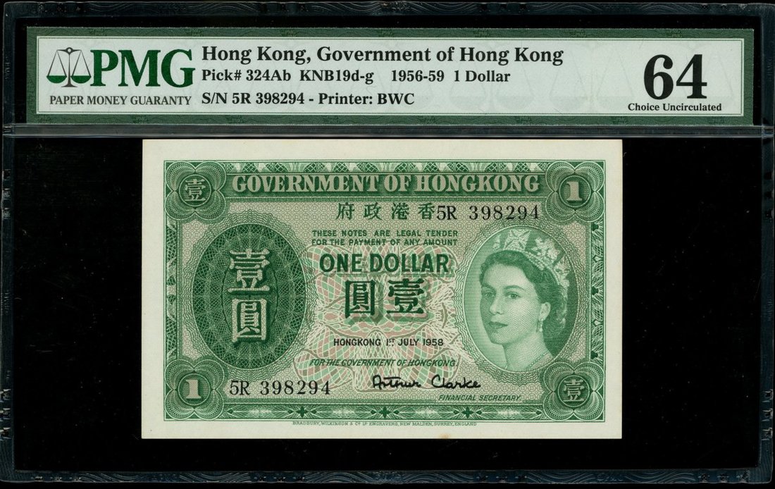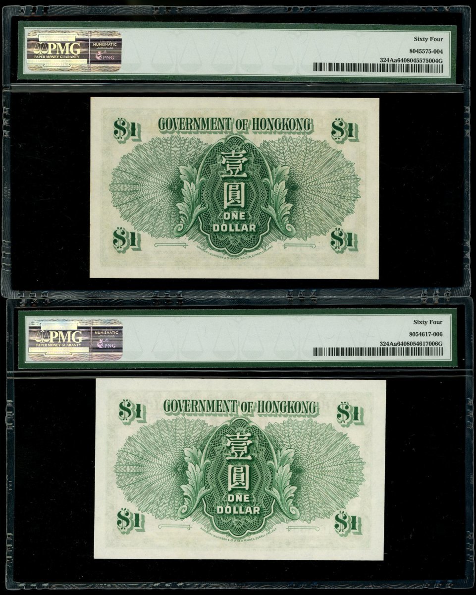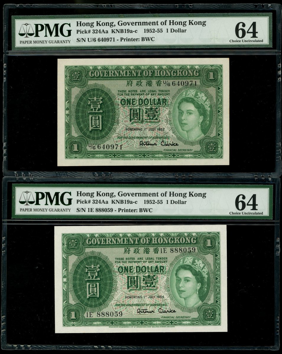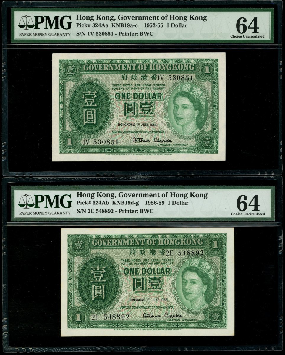 香港政府1元一組5枚,涵蓋1952,1954,1955,1956及1958年版別,編號U/6 640971,1E 888059,1V 530851,2E 548892及5R 398294,均評PMG 64