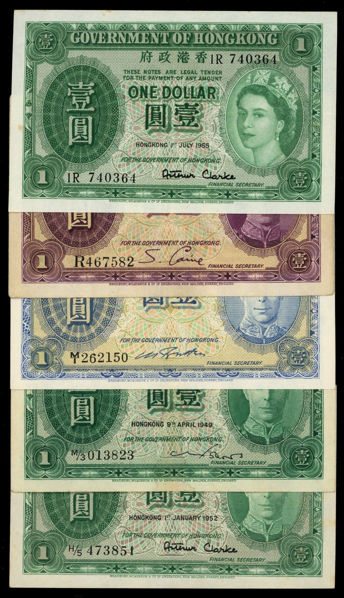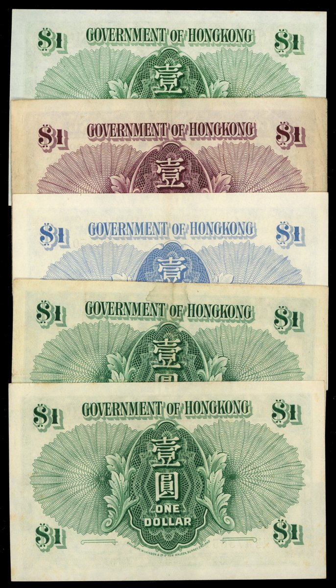 Hong Kong Government, a group of 5x $1, ND(1936) to 1955, serial number R467592, M/I 242150, M/3 013823, H/5 473851 and 1R 740364, a complete type set of George VI, along with 1955 key date,