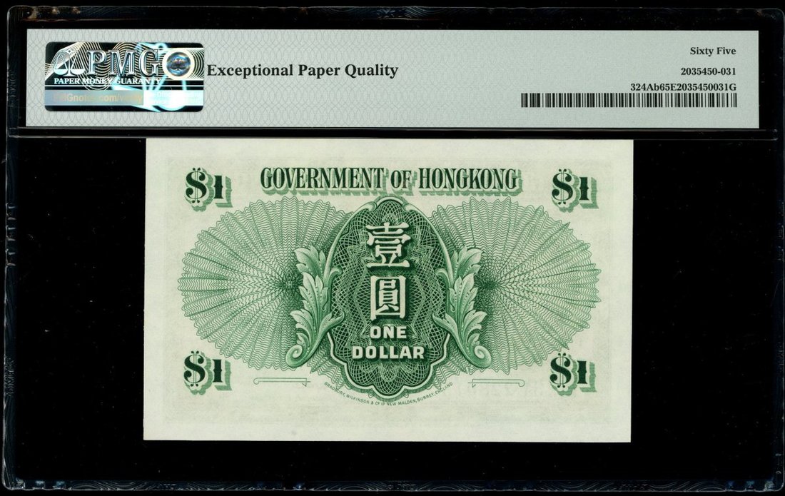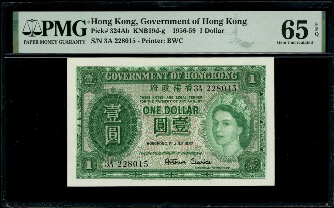 Government of Hong Kong, $1, 1.7.1957, serial number 3A 228015, (Pick 324Ab), PMG 65EPQ Gem Uncirculated.