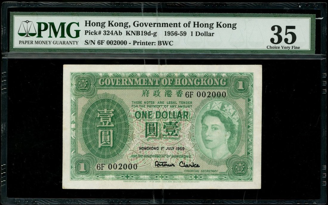 Government of Hong Kong, $1, 1.7.1959, fancy serial number 6F 002000, (Pick 324Ab), PMG 35 Choice Very Fine