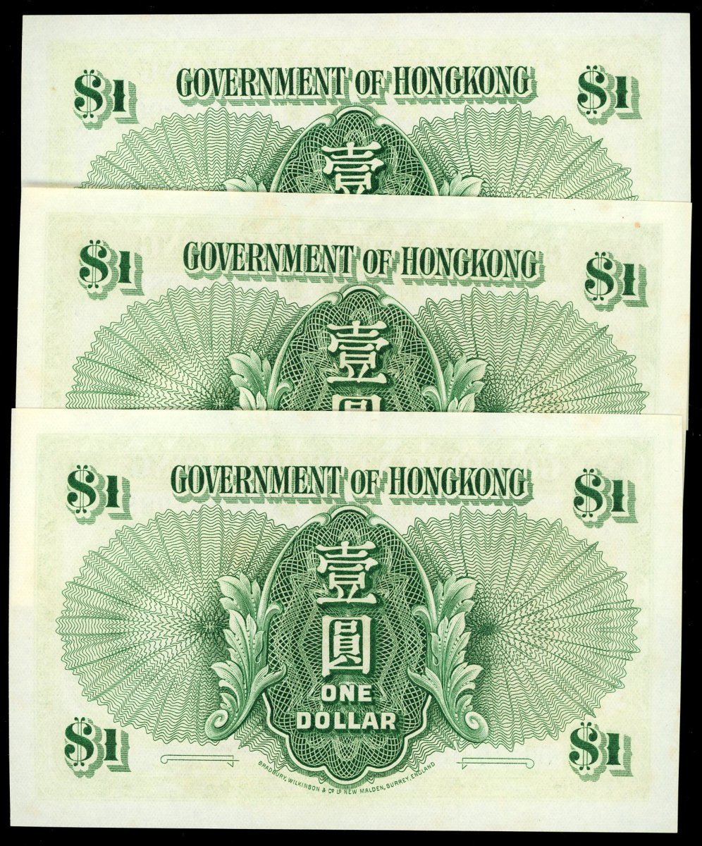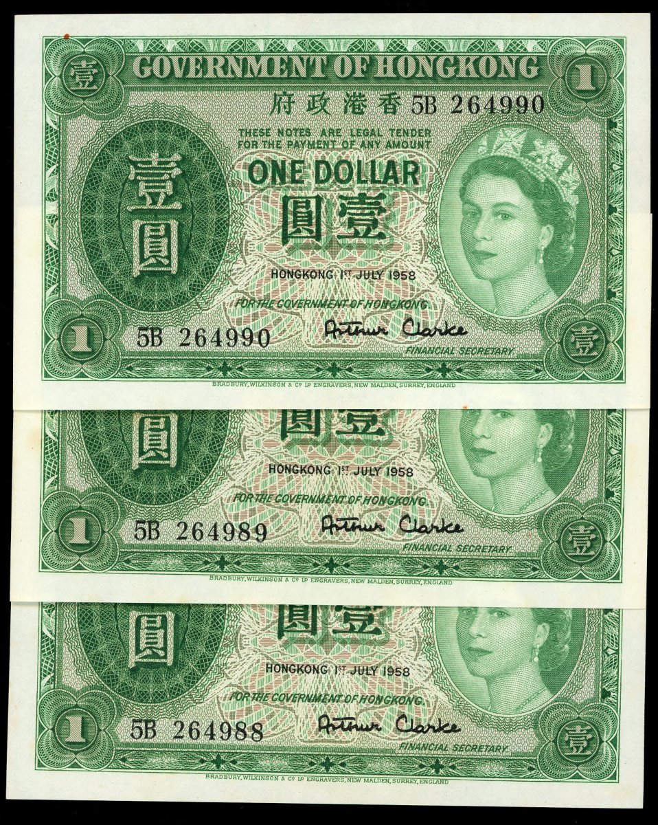 香港政府1元一組11枚,1958年3枚及1959年8枚,編號5B 264988-990及6S 724481-488,UNC,帶微黃