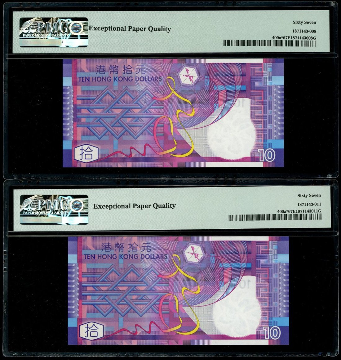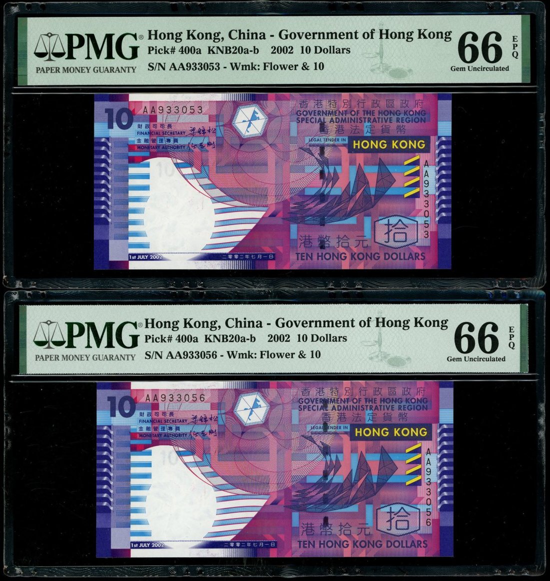 Government of Hong Kong, a group of 4x $10, a pair of Prefix AA and a pair of replacements, 1.7.2002, serial numbers AA933053, 056, ZZ266453 and 456, (Pick 400a and 400a*), The first two notes PMG 66EPQ and the replacements PMG 67EPQ (4).