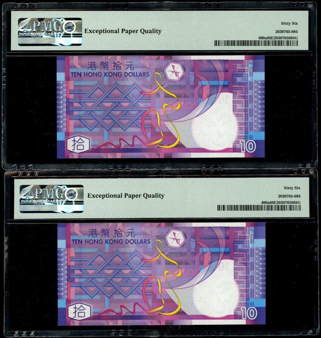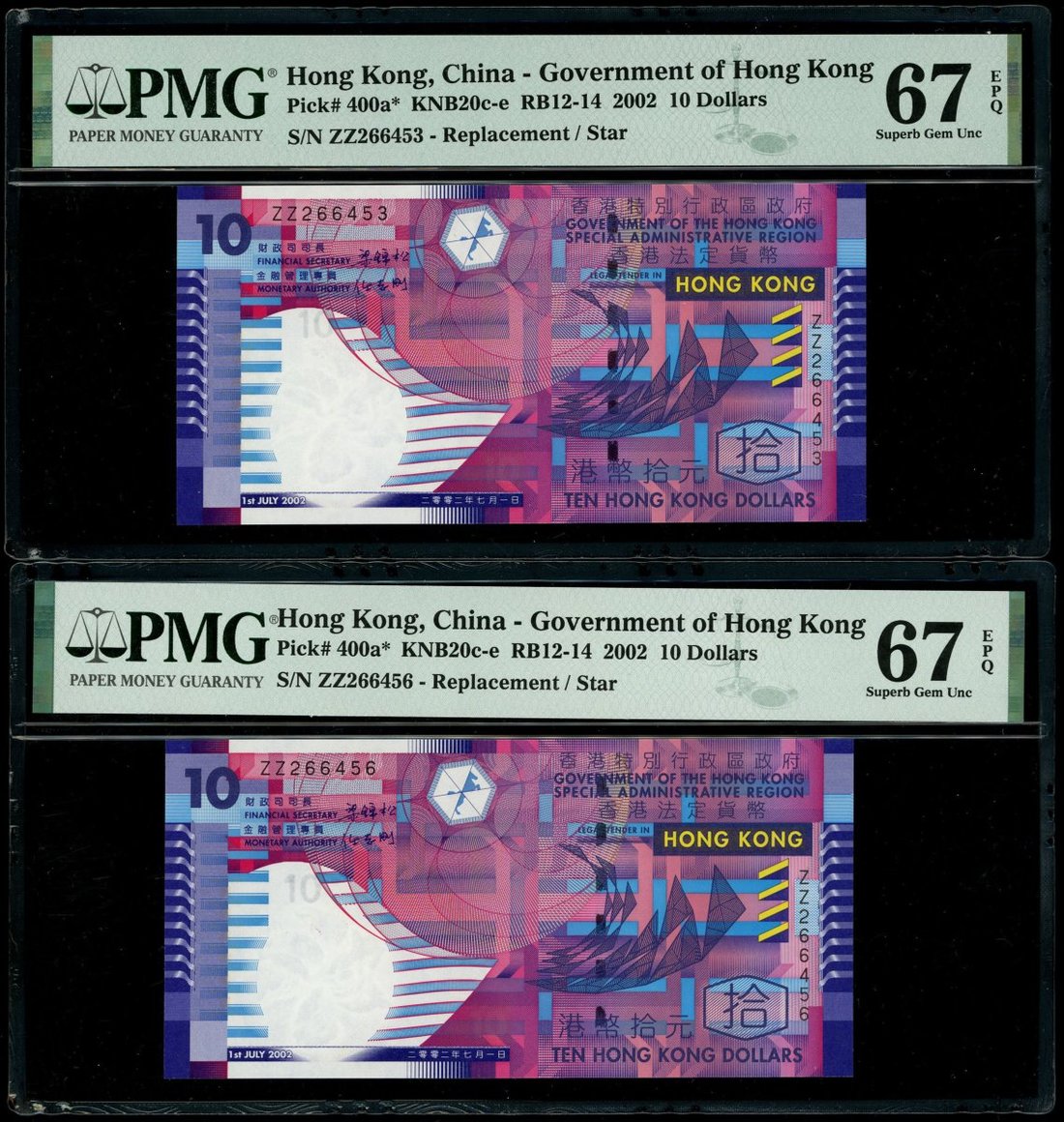 2002年香港政府10元一組4枚,包括首字軌AA及補版字軌ZZ各一對,相近編號AA933053,056,ZZ266453及456,首字軌評PMG 66EPQ,補版67EPQ