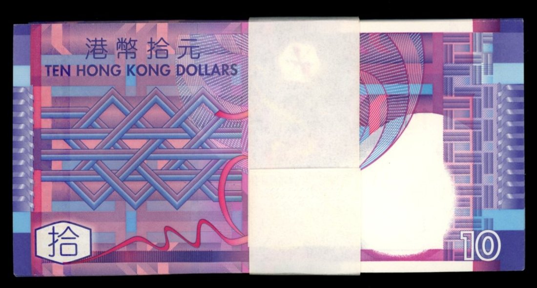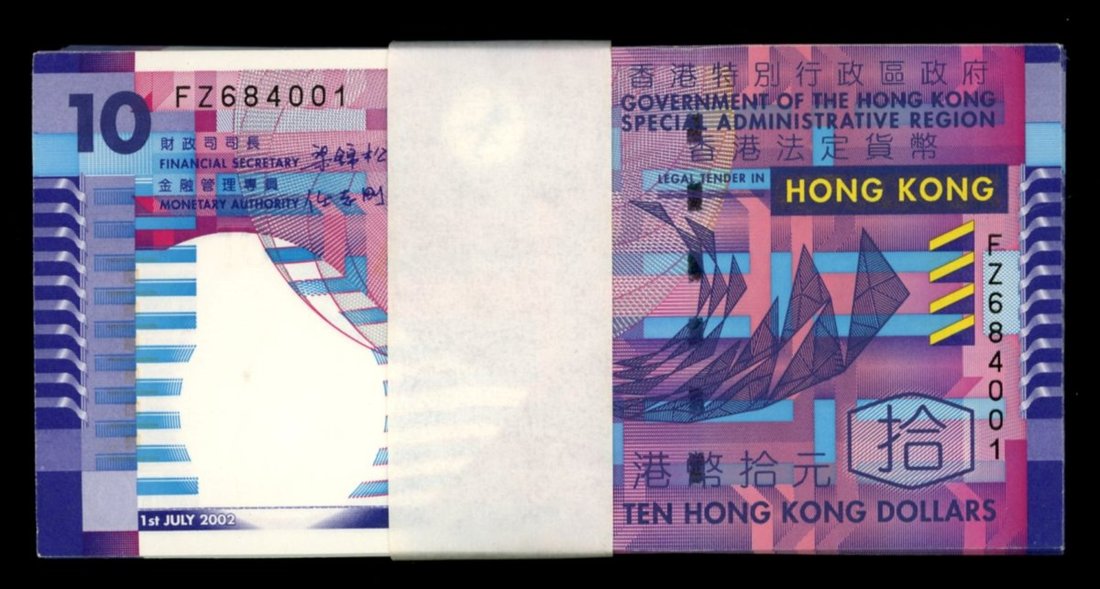 2002年香港政府十元一綑100枚,連號FZ684001, 002, 004-100,而003的位置則為一枚補版ZY091313 ,UNC,以封條綑好